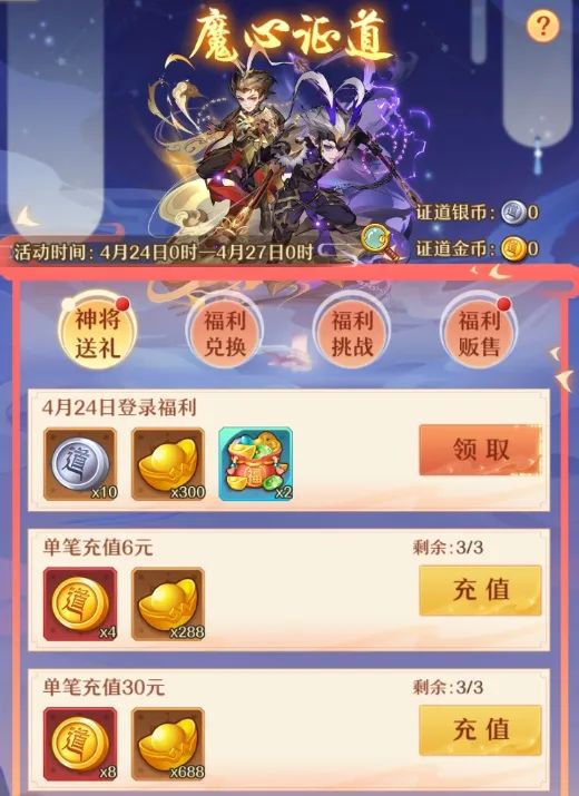 充值三次=6个神将碎片,【或4个法宝碎片。】