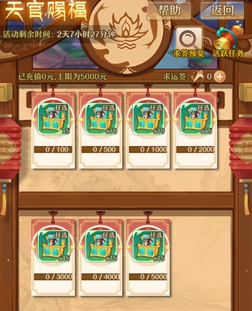 活动期间,少年们可通过游戏充值或完成指定任务获得求运签进行求运。当求运值达到一定进度时,就能领取皓金天官赐福宝箱四。