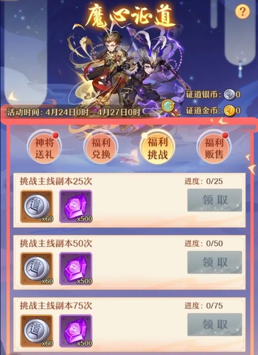 活动期间,完成挑战主线副本和竞技场任务,达到一定次数即可获得将魂,威望和双生银币奖励。