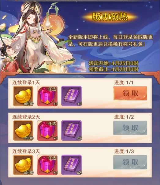 全新版本“力镇九霄”即将上线,为迎接新版本的到来,活动期间每日登录都可领取到元宝、赤金紫金资源礼包三、版更录。