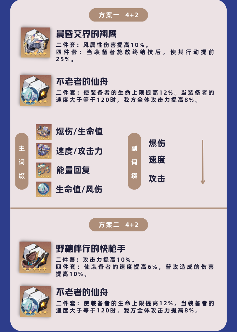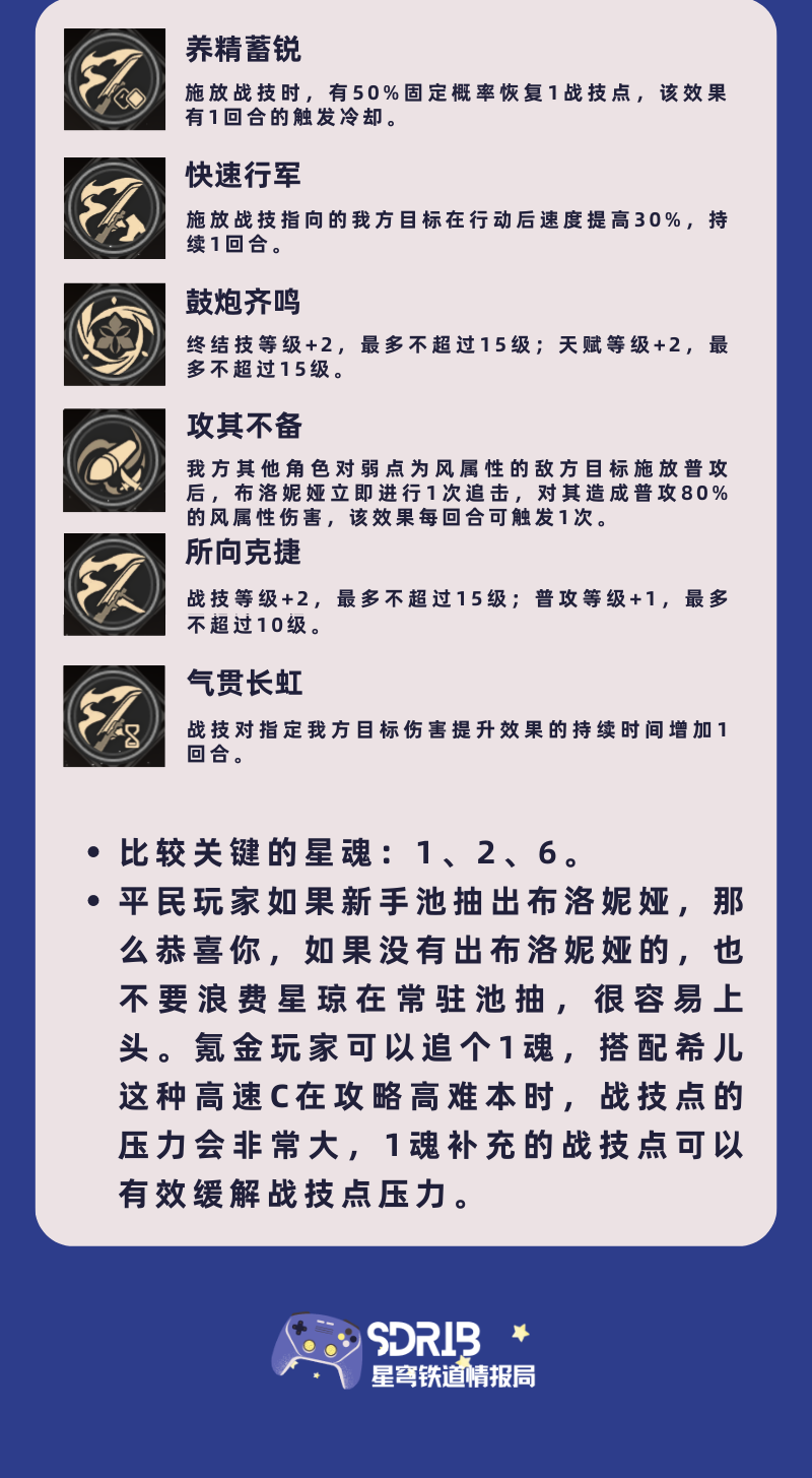 同协命途风元素角色,布洛妮娅在队伍中可以提供相当不错的输出增益与拉条增益。