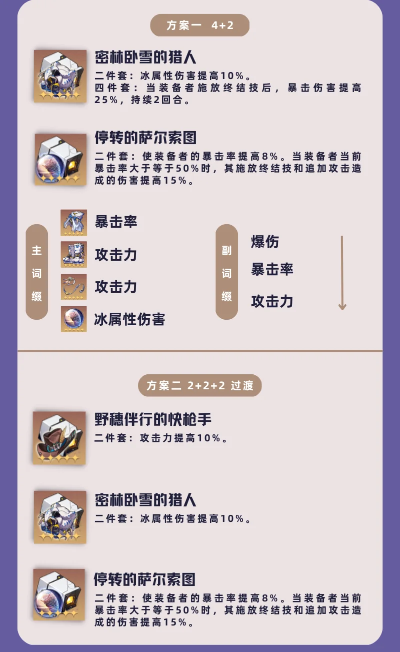 当场上每有1个敌方目标,使装备者的攻击力提高8%,最多叠加5次。当有敌方目标的弱点被击破时,装备者造成的伤害提高24%,持续1回合。