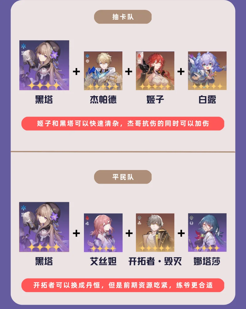 黑塔在游戏前期的地图开荒以及游戏中后期的清杂战斗中表现都很优秀,但需要注意的是,黑塔自身无法造成冻结状态,所以要触发技能【冰结】需要在队伍里面携带其他能打冻结的角色,例如三月七和杰帕德。