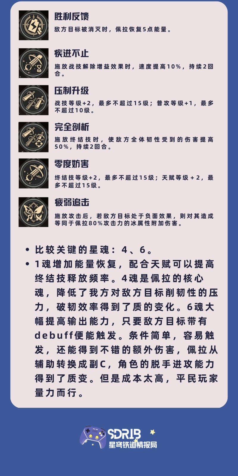 佩拉的战技可以对单个敌人造成冰伤并清除该敌人身上的增益效果,终结技对敌方全体造成冰伤并有概率使敌人陷入【通解】状态,敌人的防御力会降低33%,如果佩拉的攻击使敌人陷入负面状态则佩拉会回复5点能量。