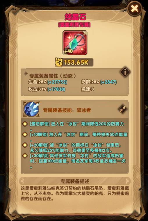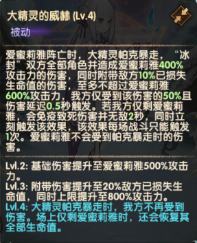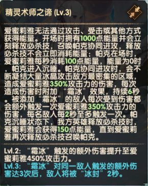 开场拥有满能量且会立刻释放必杀技,召唤帕克协同进攻,帕克会不断用冰晶攻击敌方最密集区域,造成伤害且附加“霜冰”效果,“霜冰”效果的敌人受到伤害会额外触发伤害与控制效果。