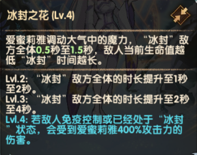 冰封敌方全体一定时间,敌人当前生命值越低“冰封”时间越长。若目标免疫控制或处于“冰封”状态,会额外受到伤害。
