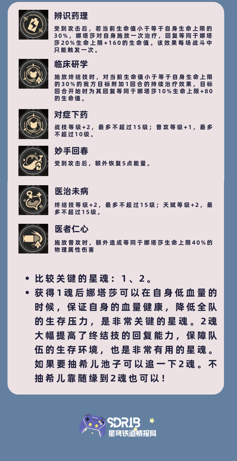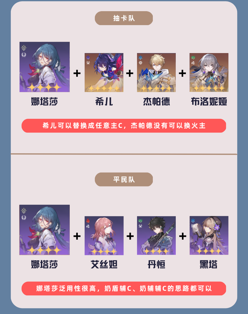 娜塔莎是目前唯二的丰饶角色,五星目前能获得的奶妈只有白露,但是白露能不能抽到有很大的随机性,如果队伍中只练存护不练奶,会有一定的缺陷,虽然盾量肯定比奶量高,但是存护的问题在于兼顾了单人就无法兼顾全队,打忘却之庭的生存压力会非常大。所以建议不管是平民还是抽卡玩家必须要练一个奶妈。