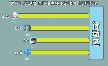 角色的【行动值】代表的是角色距【行动区】所剩的单位时间,角色的【速度】属性越高,从准备区进入【排队区】的单位时间就越短,出手顺序就越靠前。