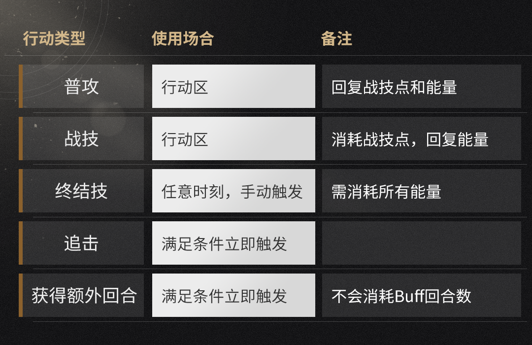 在战斗阶段中,由角色技能派生的行动有下列5种: