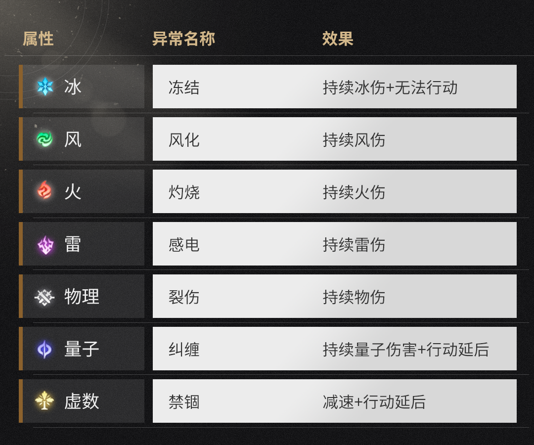 使用不同的元素属性击破敌人韧性条时,会根据属性造成不同的减益效果: