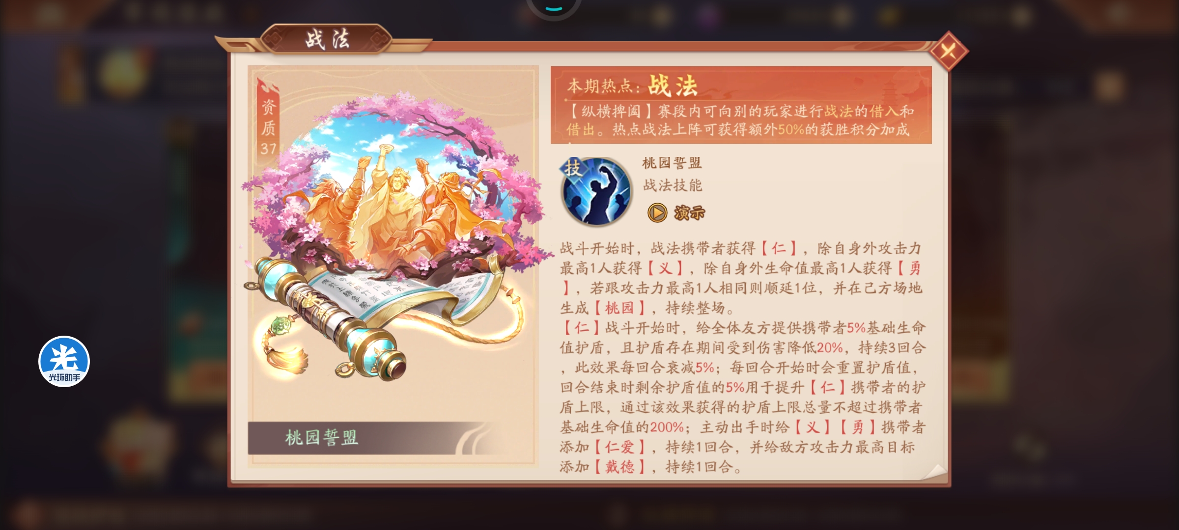 战斗开始时,战法携带者获得【仁】,除自身外攻击力最高1人获得【义】,除自身外生命值最高1人获得【勇】,若跟攻击力最高1人相同则顺延1位,并在己方场地生成【桃园】,持续整场。