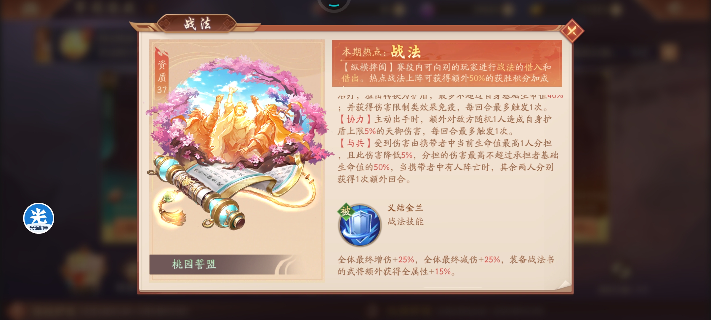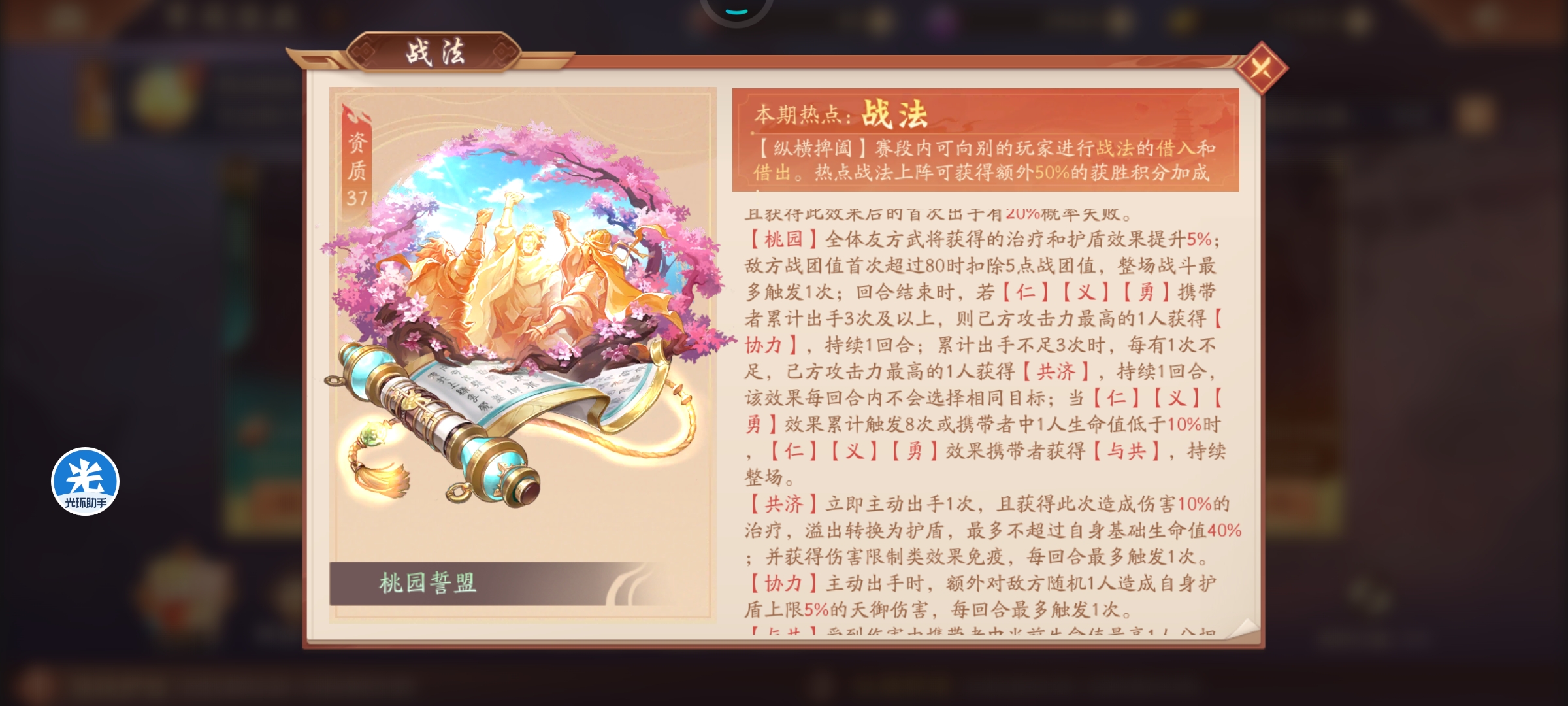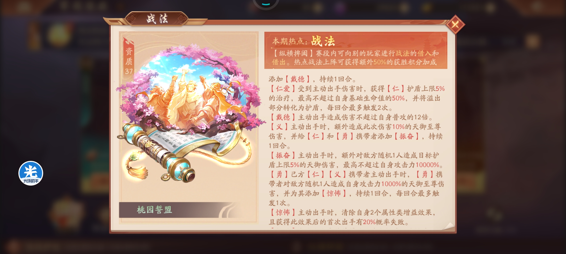 【桃园】全体友方武将获得的治疗和护盾效果提升5%;敌方战团值首次超过80时扣除5点战团值,整场战斗最多触发1次;