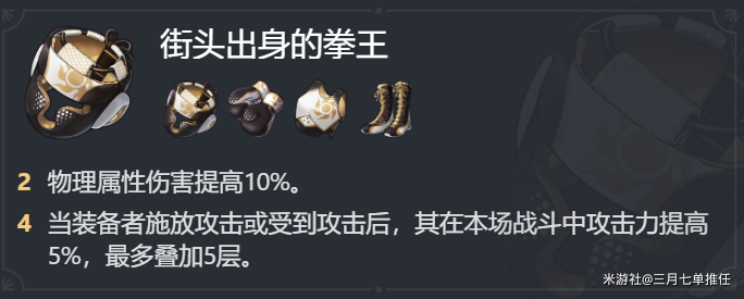 如果实在凑不齐的话,也可以把拳王四件套换成快枪手*2+拳王*2,可以同时吃到攻击力加成和物伤加成,也是不错的选择。
