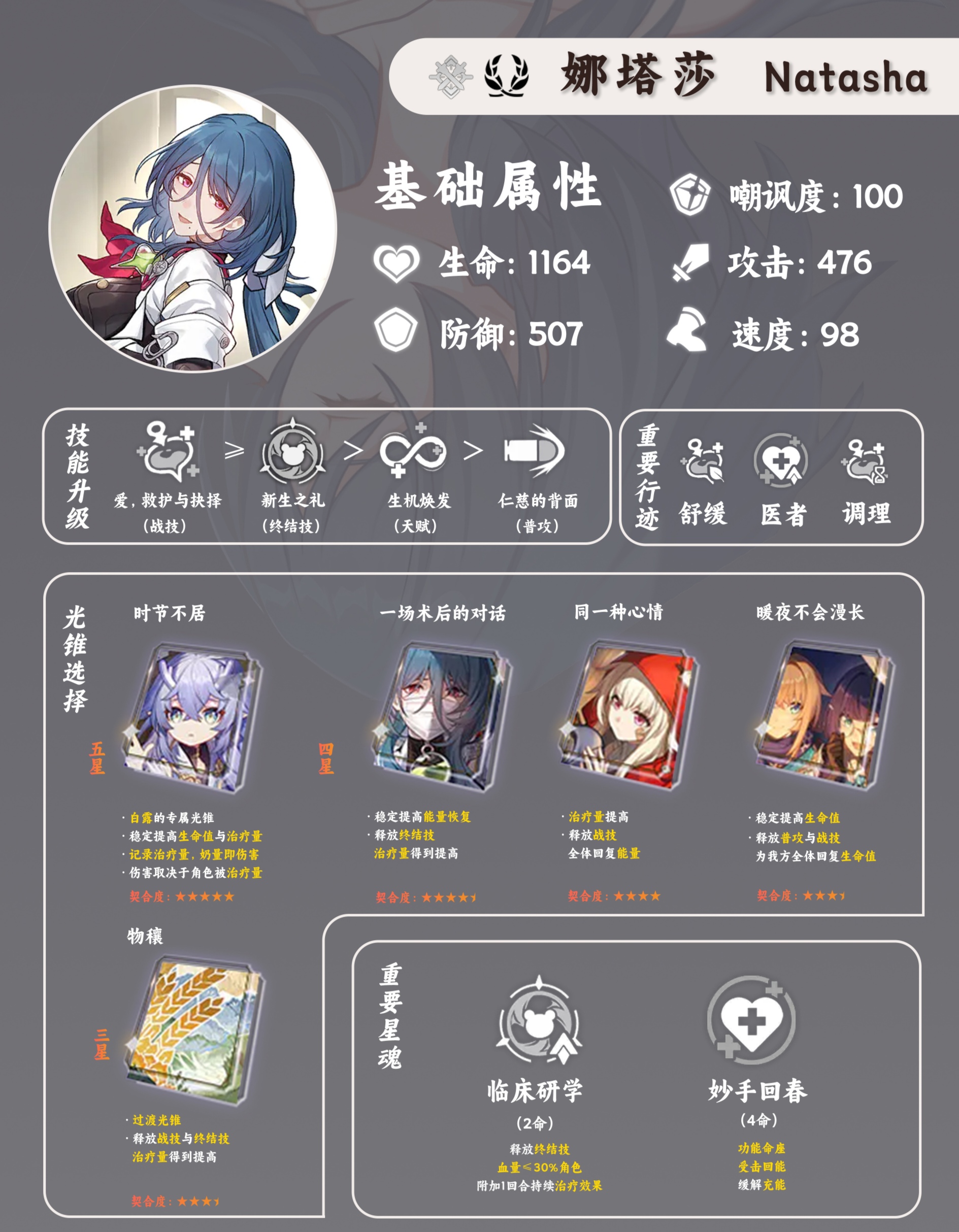 「娜塔莎」是一位物理属性的丰饶命途角色。作为丰饶角色,「娜塔莎」的战技与终结技有着不错的奶量,并且解锁行迹额外能力【舒缓】战技还可以解除1个debuff,给C位提供良好的输出空间。「娜塔莎」可以加入任何配队的4号生存位,通常作为五星奶妈白露的下位替代,如果没有白露,「娜塔莎」可以直接练起来,绝对不亏。