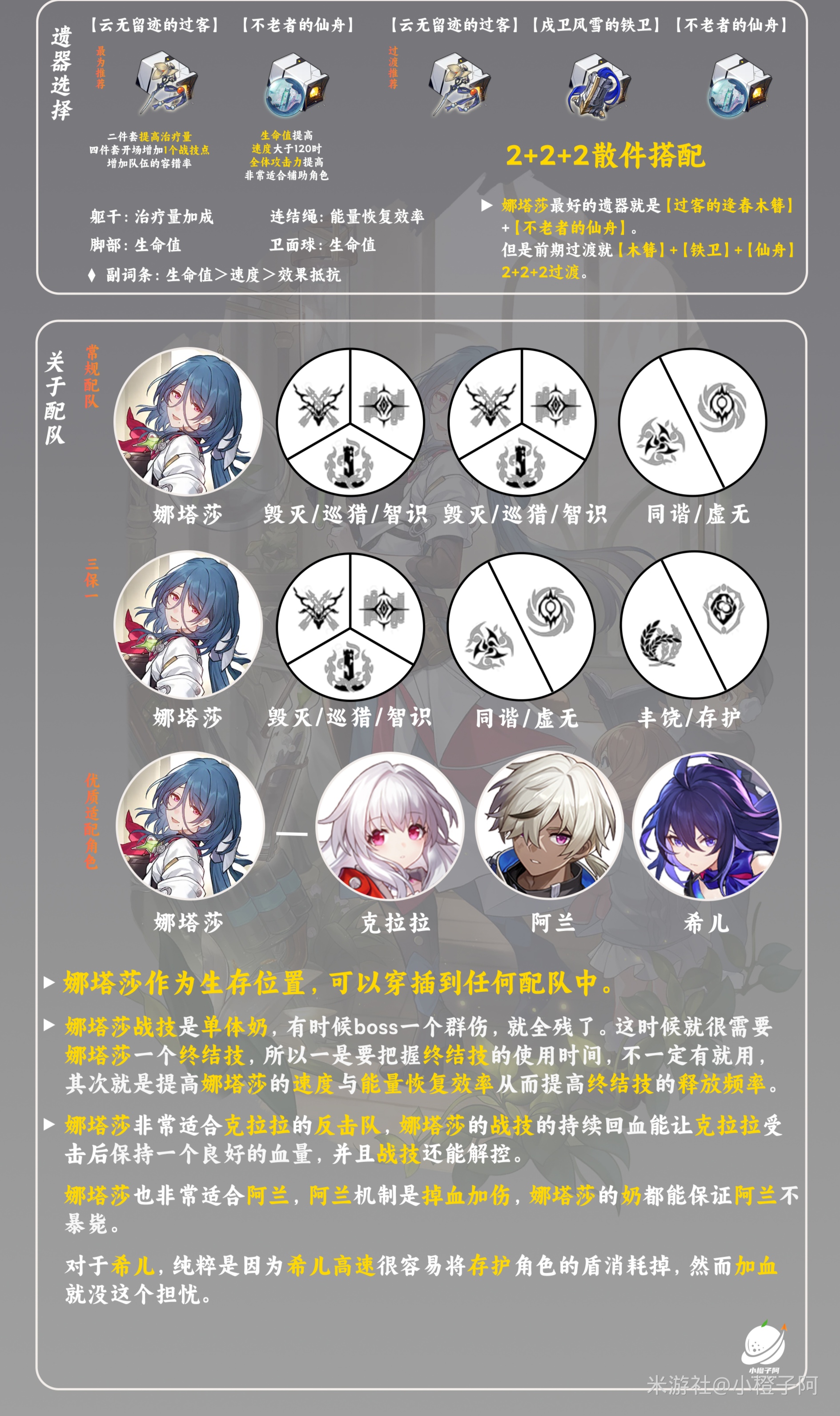 「娜塔莎」作为白露的下位替代,跟大多数丰饶存护角色差不多,哪里需要就往哪里搬,尤其是前期,没有白露与杰帕德,「娜塔莎」还免费送一只,直接练就行。这里给大家推荐「娜塔莎」配队模型: