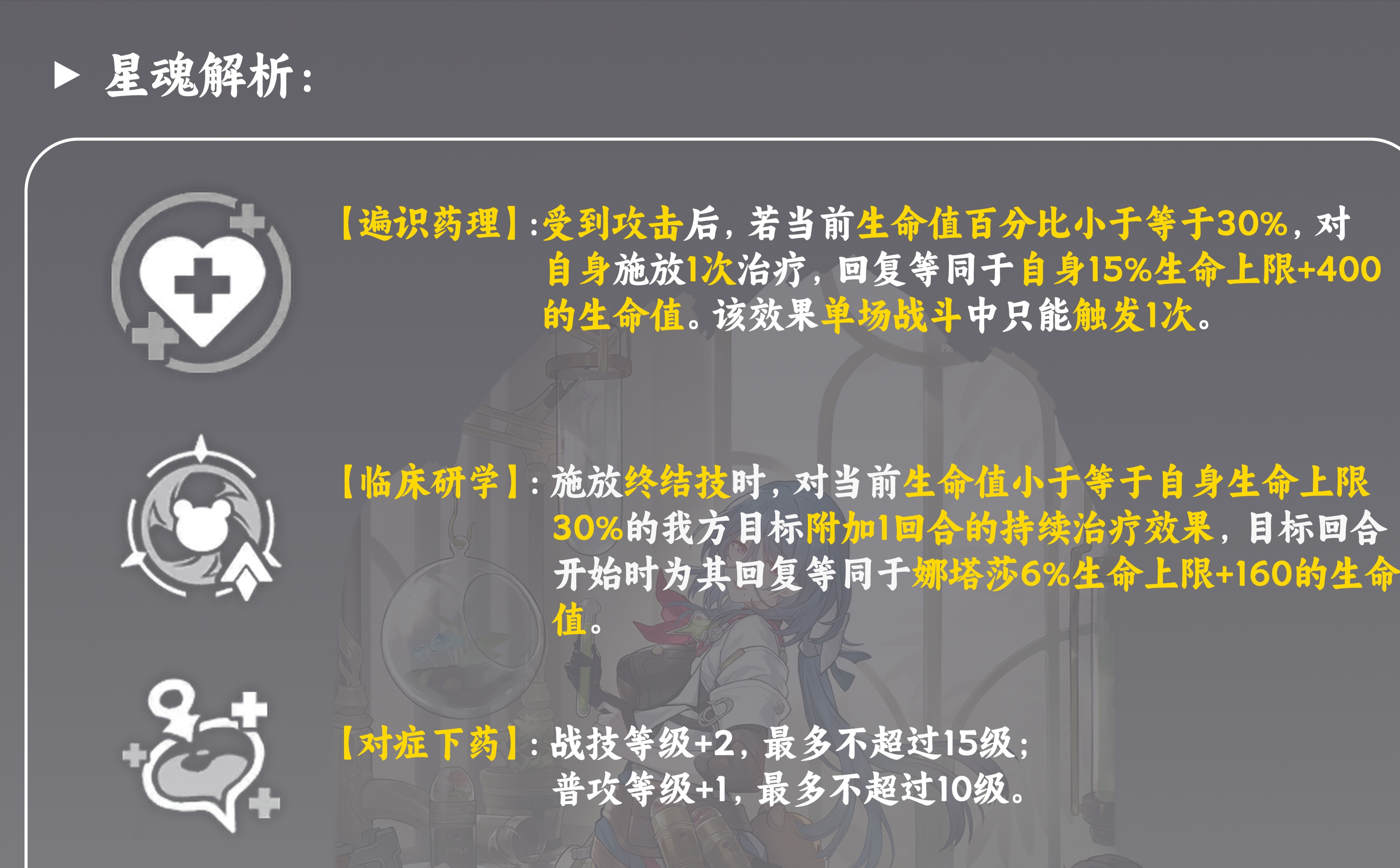 ① 单体治疗附加3回合(额外能力【调理】加了1回合)持续治疗,有些敌人会锁定攻击目标,锁定后可先战技回血保证血量安全,敌人攻击后,持续治疗再次为角色抬升血量,并且如果在高压本「娜塔莎」被控住,持续治疗效果也会保一下我方角色的血量。