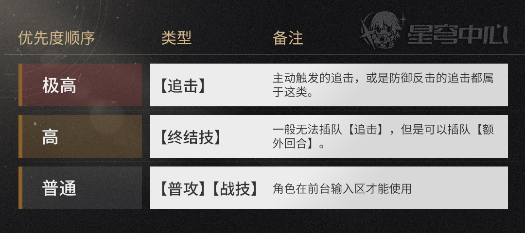 1、条件触发类型的【追击】排队优先度是最高的,在成功触发判定后会立即排在【输入区】第一位,不会被【终结技】插队,即使预输入了【终结技】,【追击】也能直接插队;