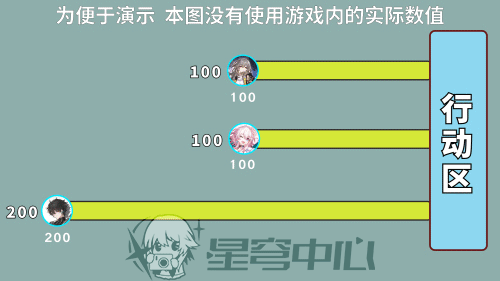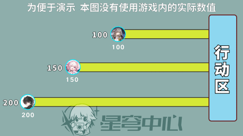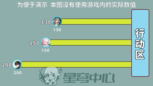 4、游戏中左上角的行动条表现的都是角色最终在【行动值】以及【行动顺序】的变化。同等【距离】的变化,在不同速度的角色身上表现就是速度快的角色【行动值】的绝对值变化小,速度慢的角色【行动值】的绝对值变化大。