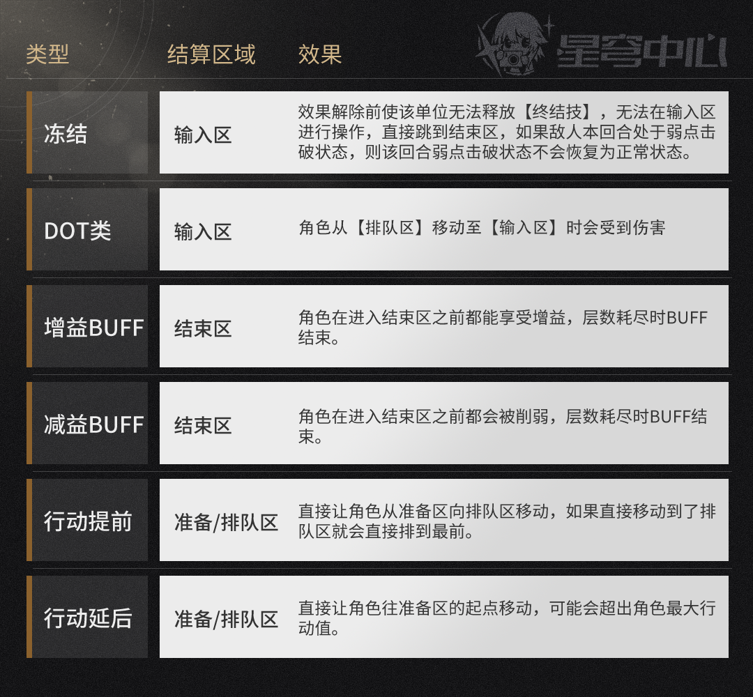 一般来说,角色只有在完整地跑过【排队区】、【输入区】、【行动区】、【结束区】这四个阶段,才会计算一次回合结束,而【追击】、【额外回合】、【终结技】这些插队到【输入区】的行动,由于不需要经过【排队区】,这些动作执行后不会结算增益或是减益BUFF,也不会触发DOT。