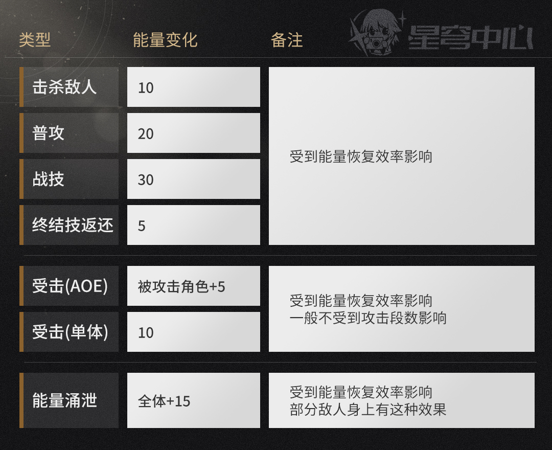 知晓能量的恢复规律,即可通过计算能量用以规划角色的【终结技】释放时机,或是执行通过留一些敌人的小怪的操作,以达成故意吃下攻击恢复能量的战术也都与能量恢复息息相关。计算具体恢复直接用能量变化系数与能量恢复效率相乘即可。