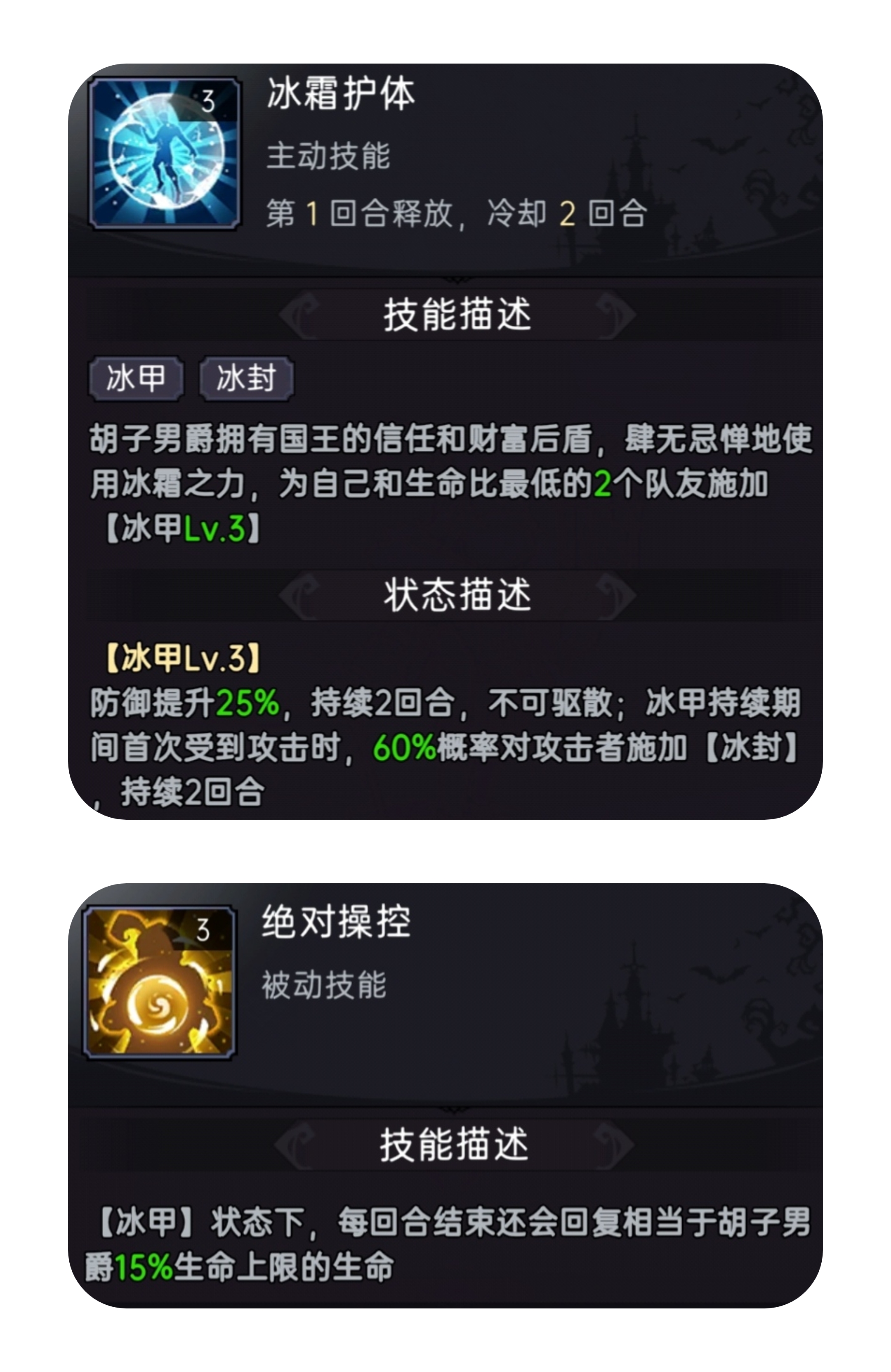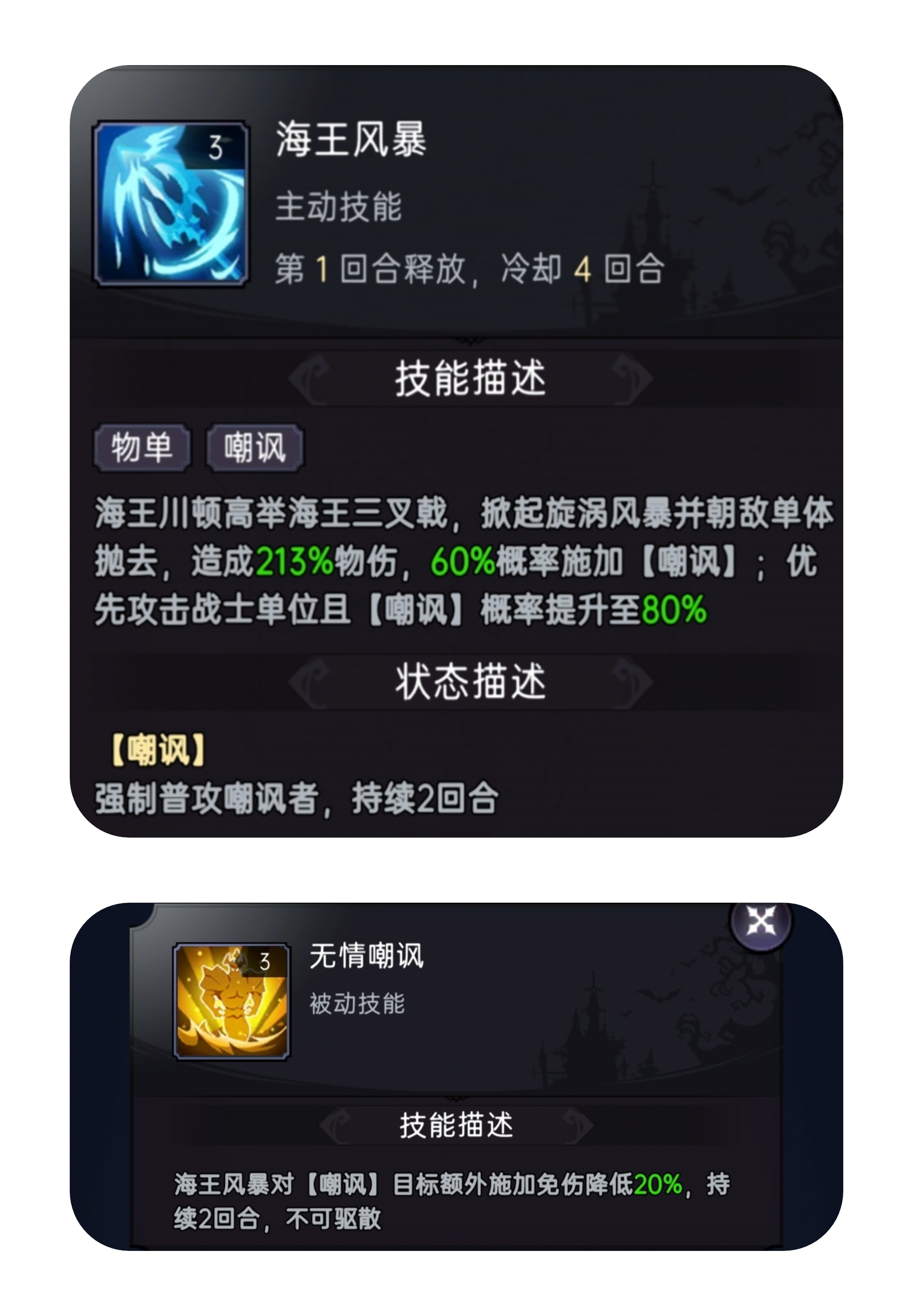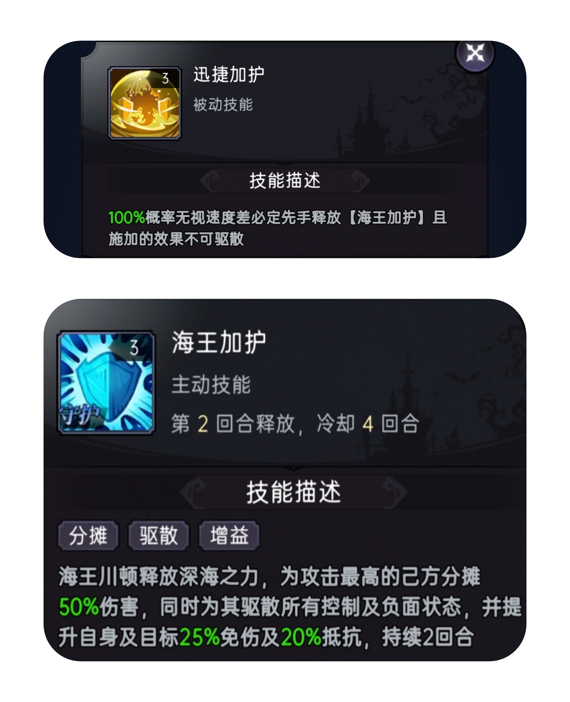 海王的大招必定先手双净化(海王+小吉),且双方抵抗+20%:再搭配胡子,可以有效的帮助阵容更好的应对一定控制问题。