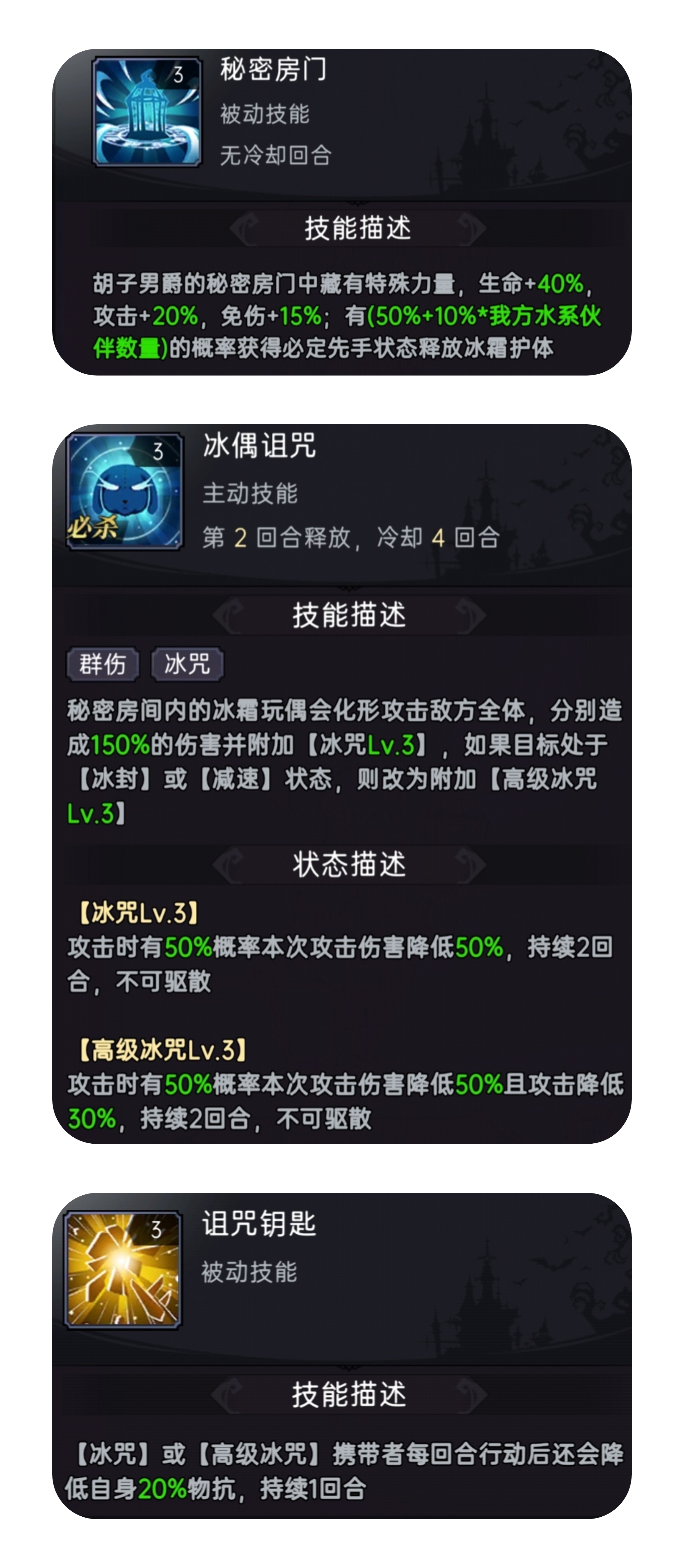 三水阵容至少有90%概率必定先手释放大招,减伤也能有效在一定程度上克制绝大多数的爆发阵容,提高己方阵容的整体生存,同时【冰咒】、【高级冰咒】也更贴合搭配战士阵容。