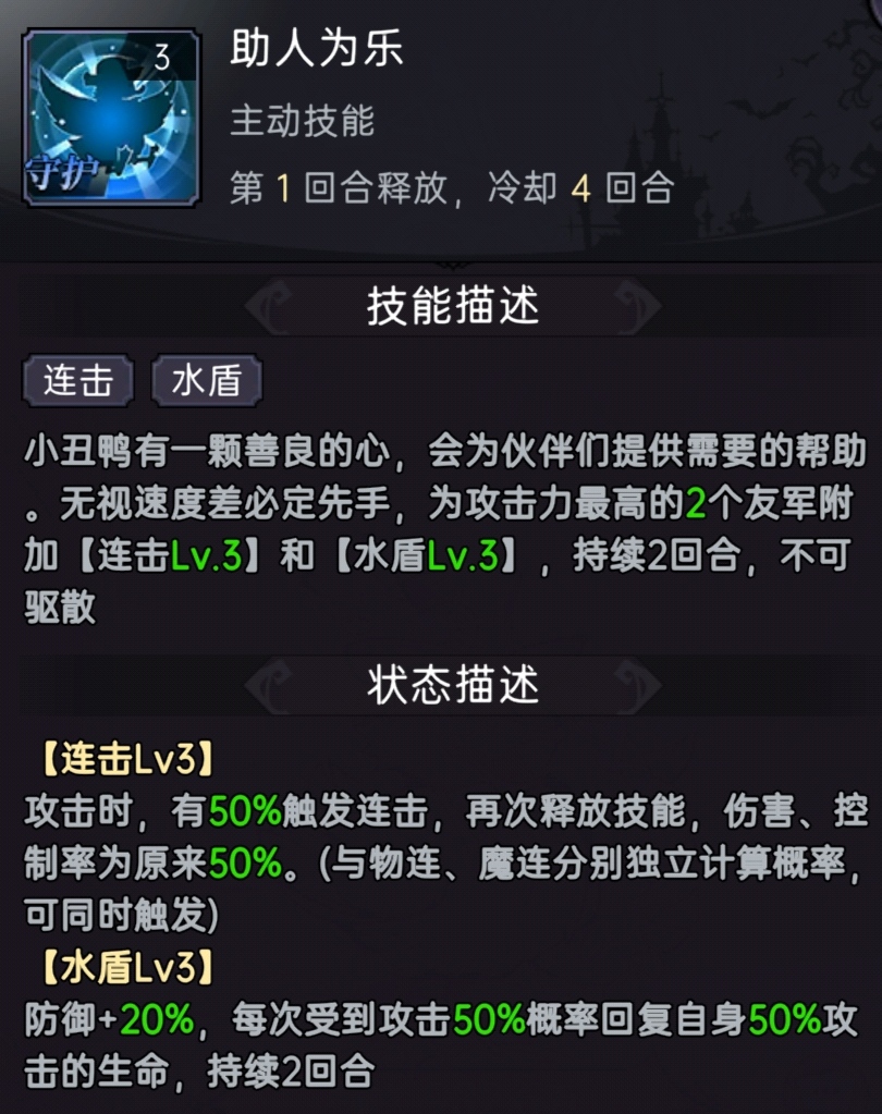 必定先手释放,为攻击最高者分摊伤害,可以有效保障小吉的生存和防点杀;提供双方净化+20%抵抗也可以更好的保障小吉状态和应对控制。