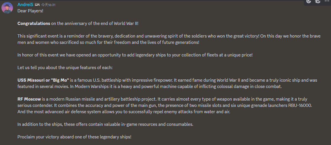 现代战舰又有新活动啦,5月8日,为了庆祝第二次世界大战结束,玩家将可以已优惠的价格购买密苏里号战列舰和莫斯科RF战列舰,此外还包括了游戏内的其他资源和商品。