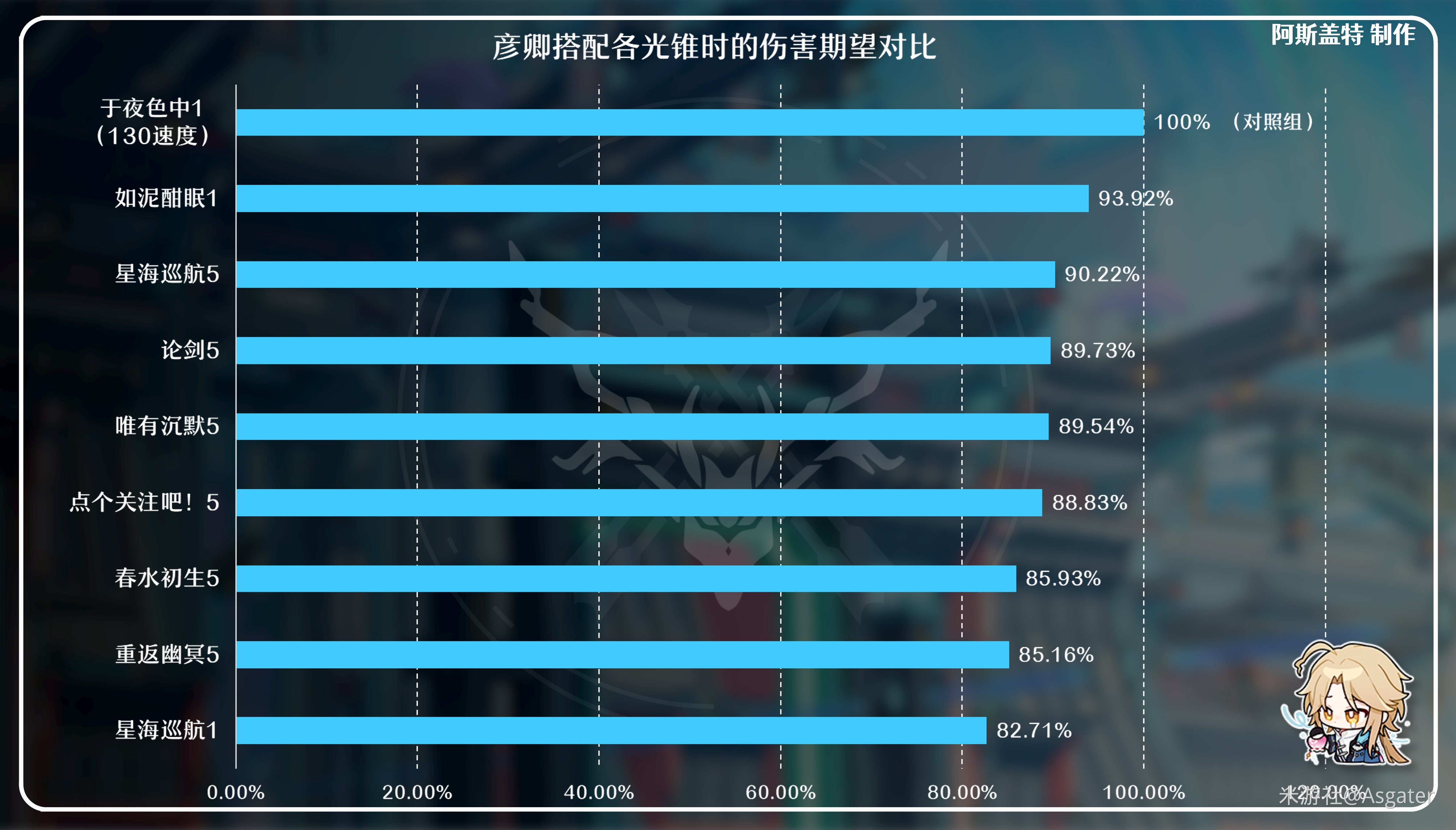 彦卿的技能是多段数攻击,在装备论剑时可以快速触发论剑的高层数特效,尤其是在BOSS攻坚时基本是常驻满层特效,可作为除「于夜色中」、「如泥酣眠」外的第三选择。对于双暴提升手段较多的彦卿,论剑可以补充彦卿的增伤区间,是当前版本四星光锥的首选。
