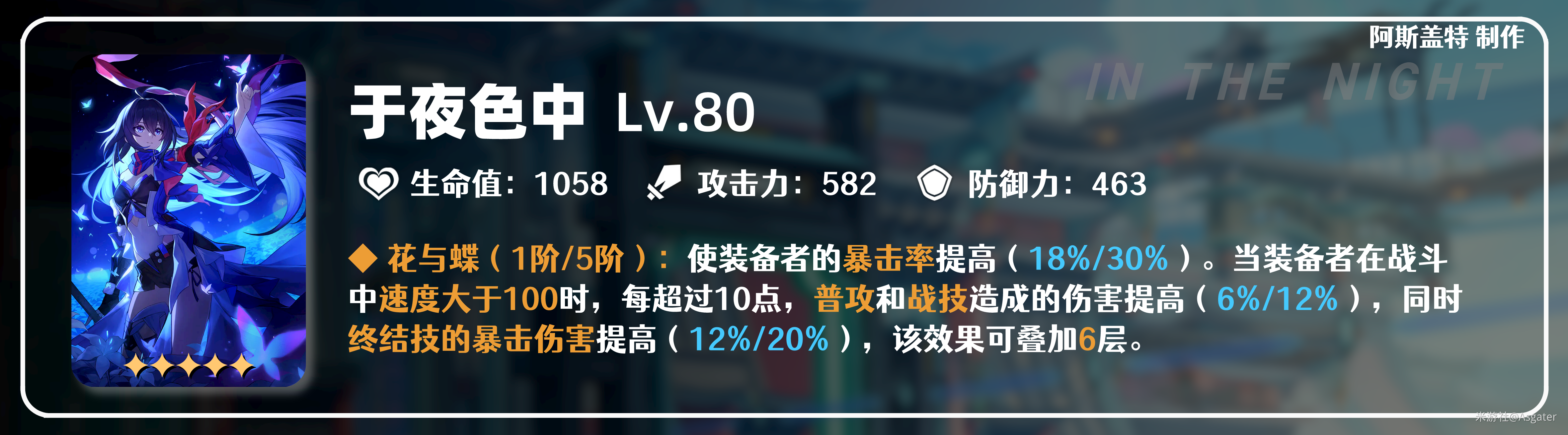 首选光锥,彦卿自身通过技能可以获得额外的暴击率、暴击伤害提升,而于夜色中通过堆叠速度可获得普攻、战技增伤,以及终结技暴伤,推荐优先选择。彦卿在均衡六可以解锁行迹天赋「轻吕」,可使彦卿的速度进一步提高。