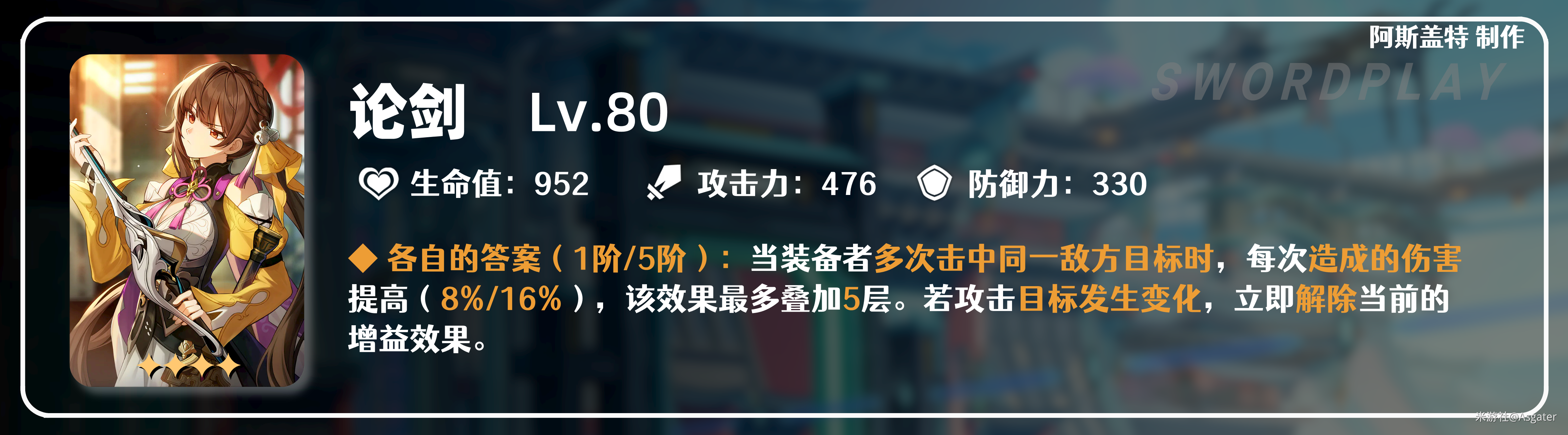 通过模拟宇宙兑换得来的可肝光锥。彦卿本身的暴击率需要较小(需求小,但并非没有),如果通过遗器方面已经堆叠了25%-40%的暴击率,那么可以不优先考虑。而且在面对BOSS时,或者彦卿没有将敌人消灭时,该光锥的特效将一定程度上折扣,在对单的BOSS攻坚中的优先级要于「论剑」。