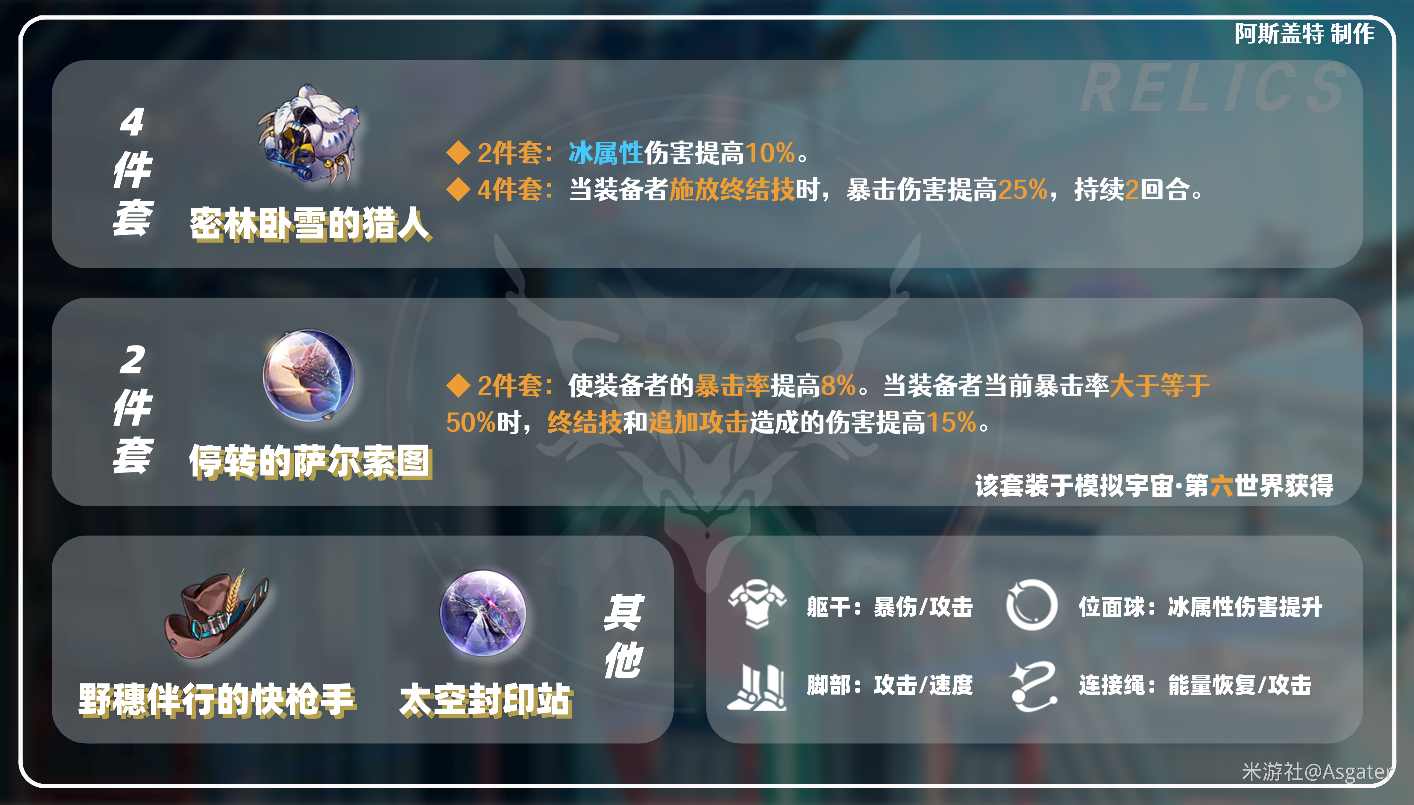 ①.遗器的套装往往是“4+2”的组合式搭配,优先考虑上图中的「密林卧雪的猎人」4件、「停转的萨尔索图」2件。