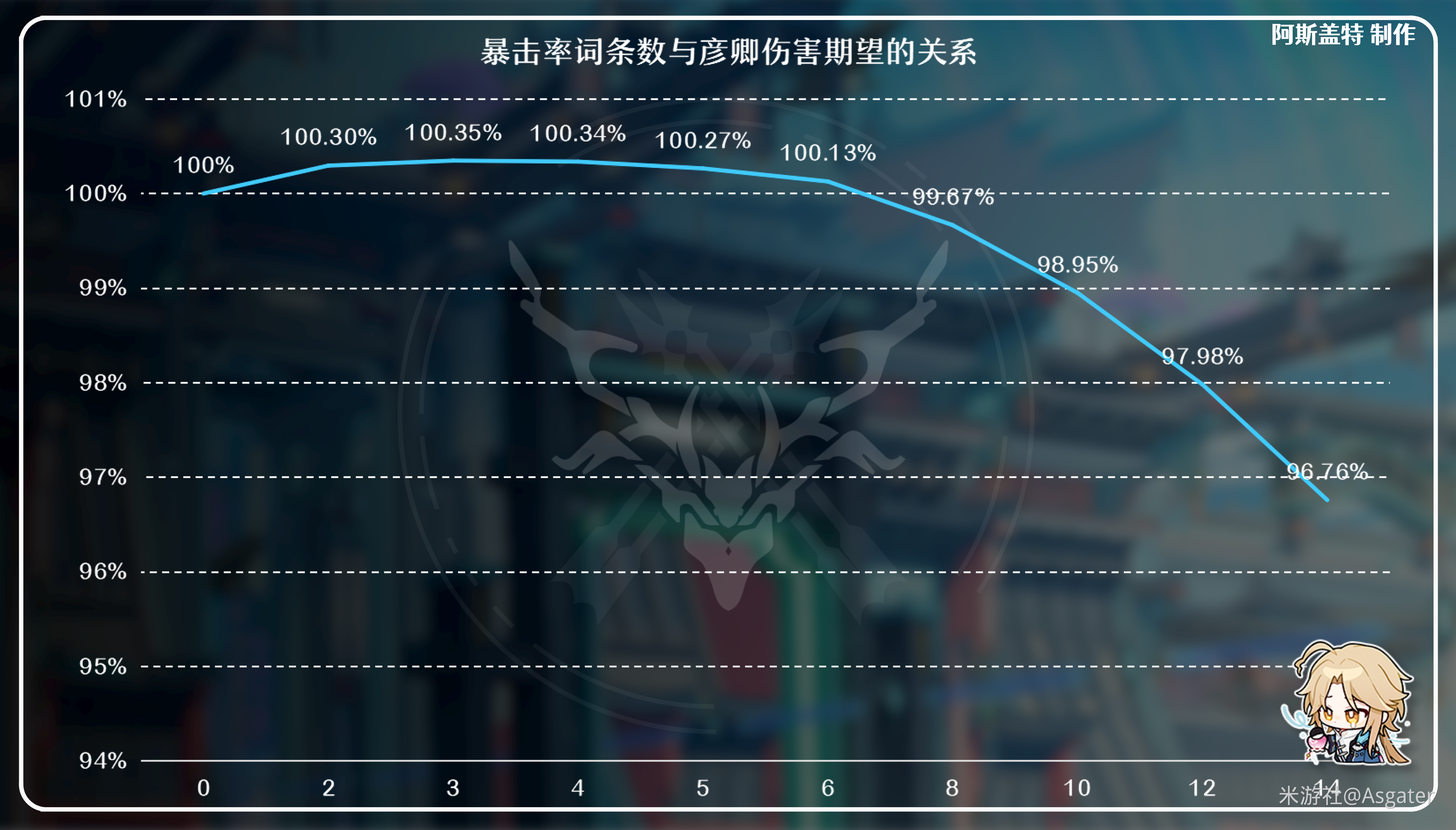 通过上面的曲线我们可以清晰的了解到,当暴击率词条数在3-8条时,整体差距并不大,如果队伍的其他回能手段少,可以将暴击率堆叠至25%-40%之间。(凹核爆或在未来可能有暴击拐时可以降低暴击率)