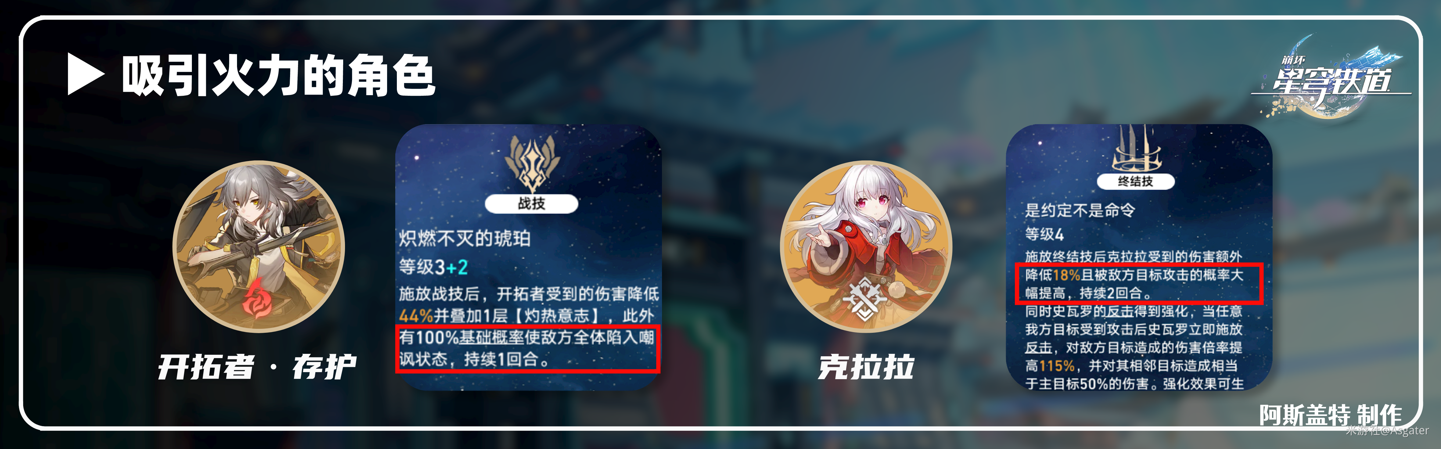 ②.开拓者·存护战技的嘲讽值改变较为特殊,战技使敌人处于嘲讽状态,使队友的嘲讽值降低100%,以达到只攻击开拓者·存护一人的目的。