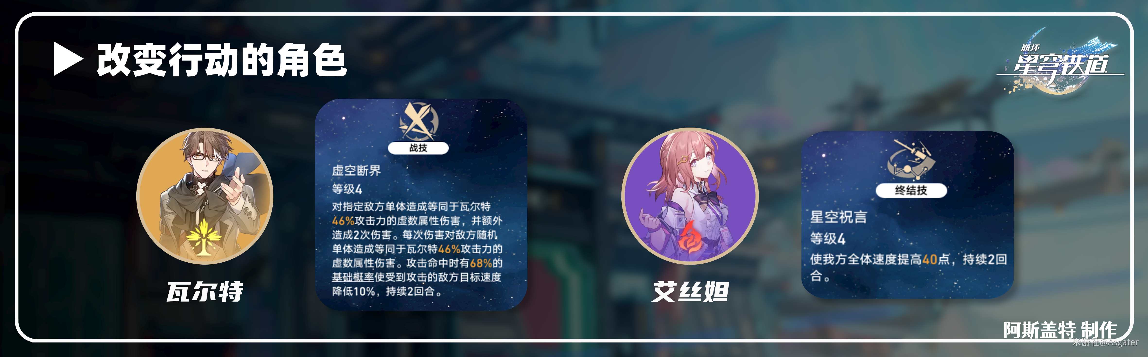 ②.艾丝妲不仅终结技可以提高队伍的速度,天赋技能也可提供额外的攻击力。此外,当作为火属性破盾时,尤其时在面对单一敌人,其降低敌人韧性条的速度极快。
