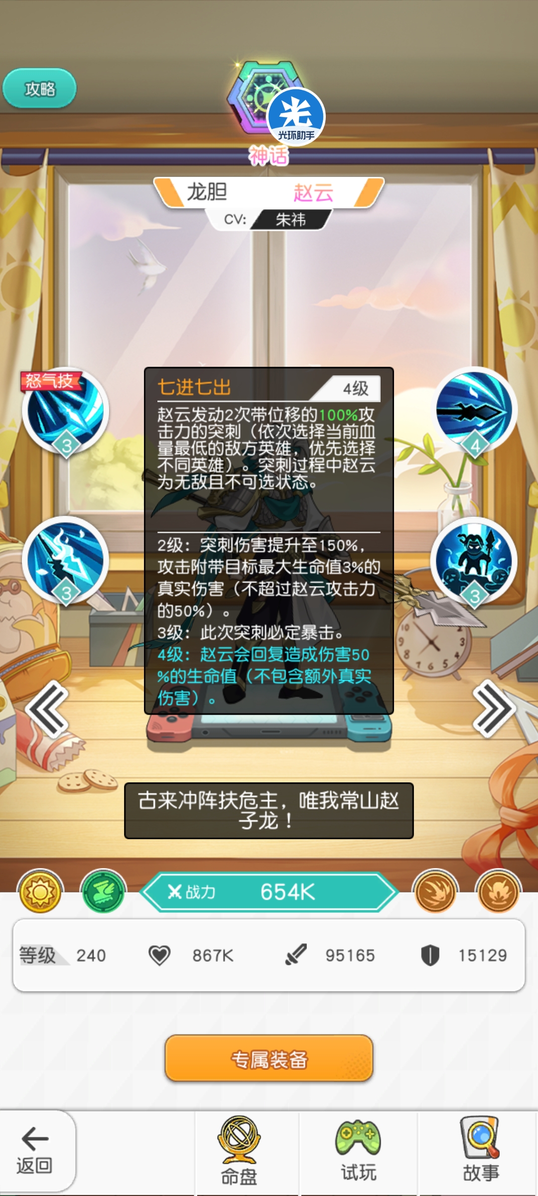 总结:优秀的rmb敏捷大c,个人感觉不是完美适配现在的保四流体系,但是作为大c放里面也能用,强度也不差。搭配敏队个人感觉更舒适,但是敏队目前缺乏一个能提升续航的英雄,防阵里没有统治力容易掉点。搭配关胜火将也不错,脆弱的关胜跟赵云的龙魄非常搭配,开大之后全场的清盾也很适合赵云之后的发挥,并且火将的初始怒气以及光环buff对于赵云相当适配。