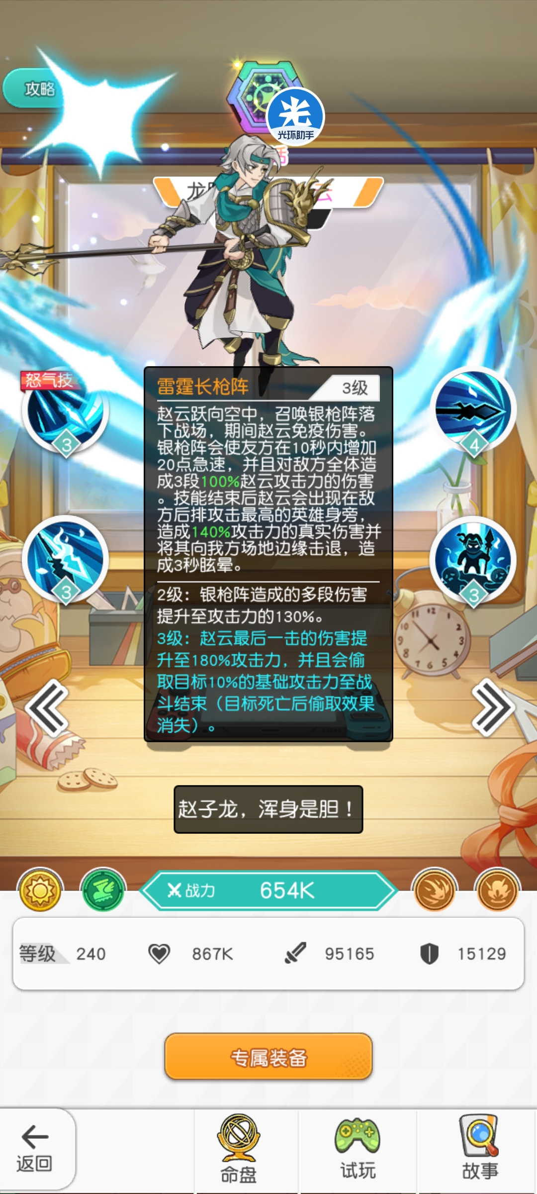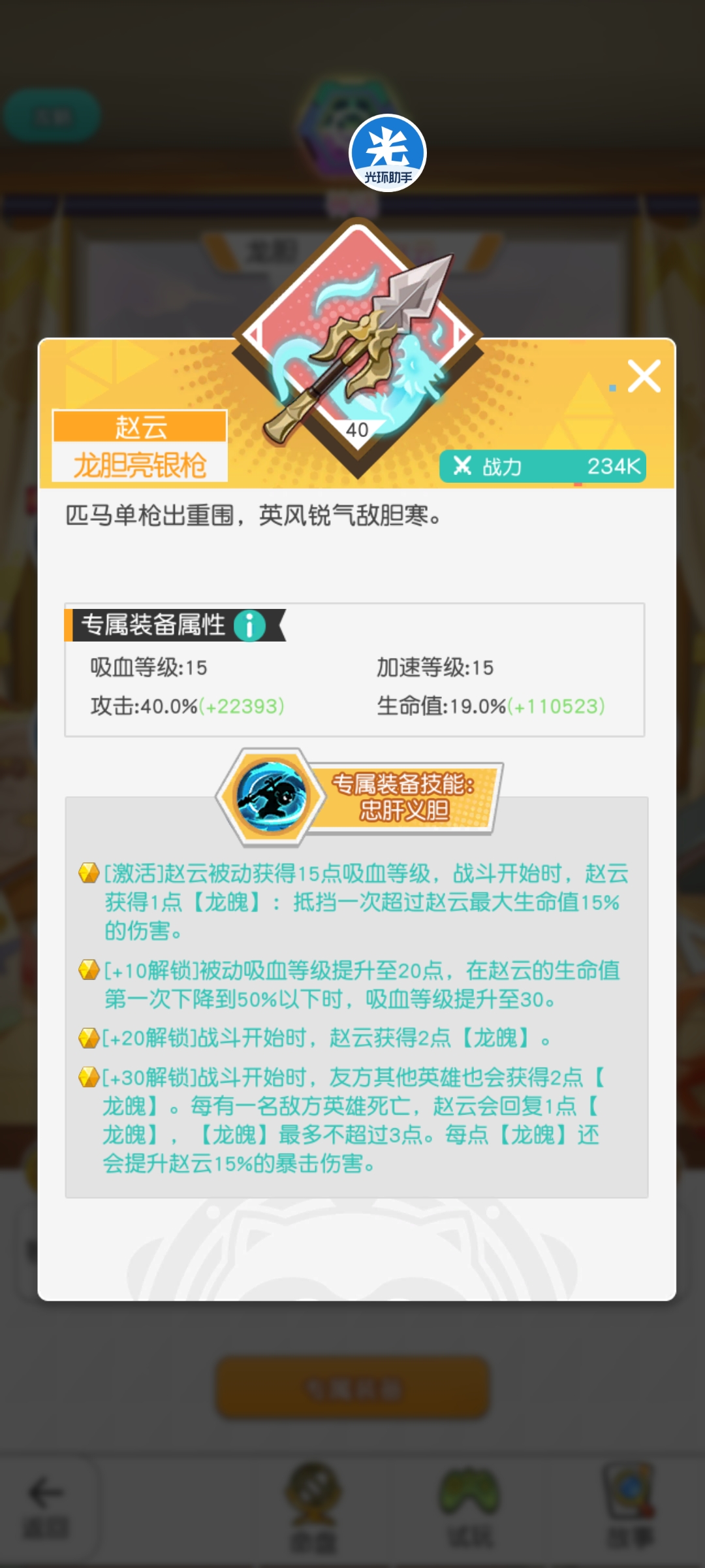 专武(20-30):“龙魄”覆盖给场上的队友,并且队友阵亡,赵云额外获取一次“龙魄”,且每层龙魄提升赵云15%暴击(最高45%)