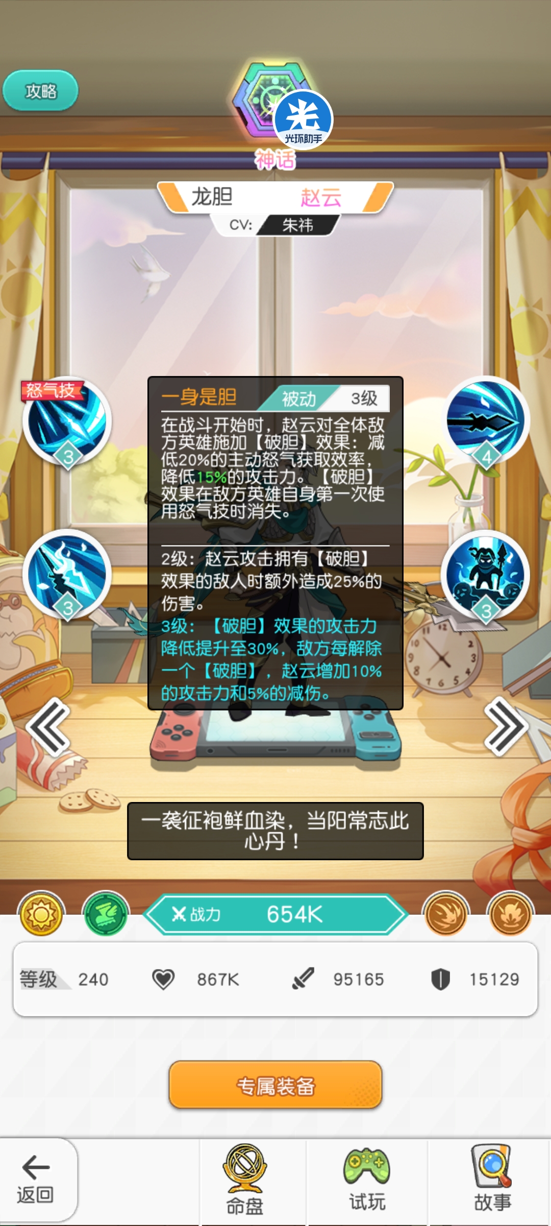 技能效果:敌方英雄第一次开大之前,被套上“破胆“debuff(降低20%怒气回复/降低15%攻击力/赵云对“破胆”目标伤害增加)并且没解除一个破胆,赵云增加自身10%攻击力和5%减伤(也就是说最多能增幅50%攻击力+25减伤)