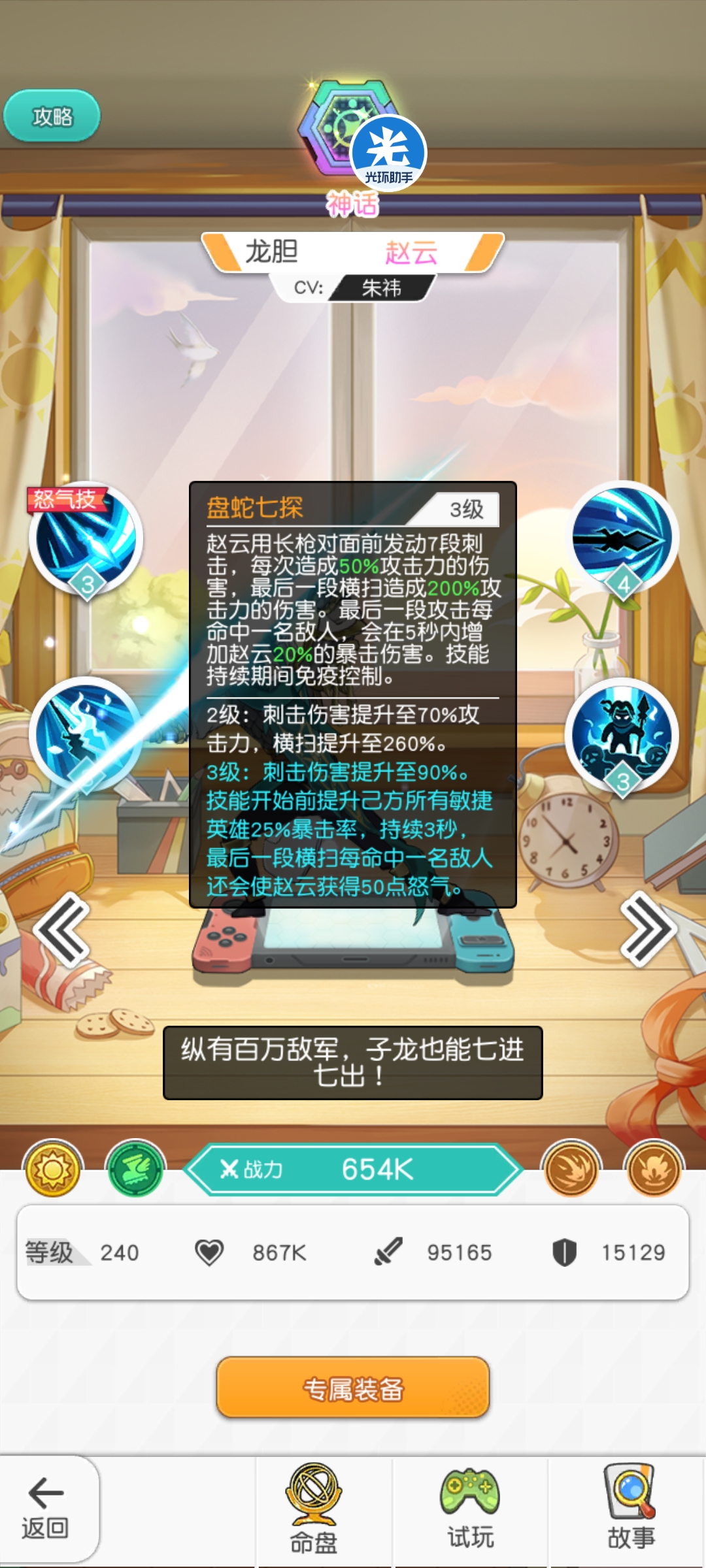 技能评价:①降低怒气回复,己方开大速度更快②降低对面攻击力,保证前期过度③赵云(前期技能对轰期)伤害增幅,纯硬拉输出下限④后期怒气技对轰之后,加强自身攻击以及肉度,保障后期输出强度(三国英雄就是不一样,一个技能包含了花色英雄好几个被动)