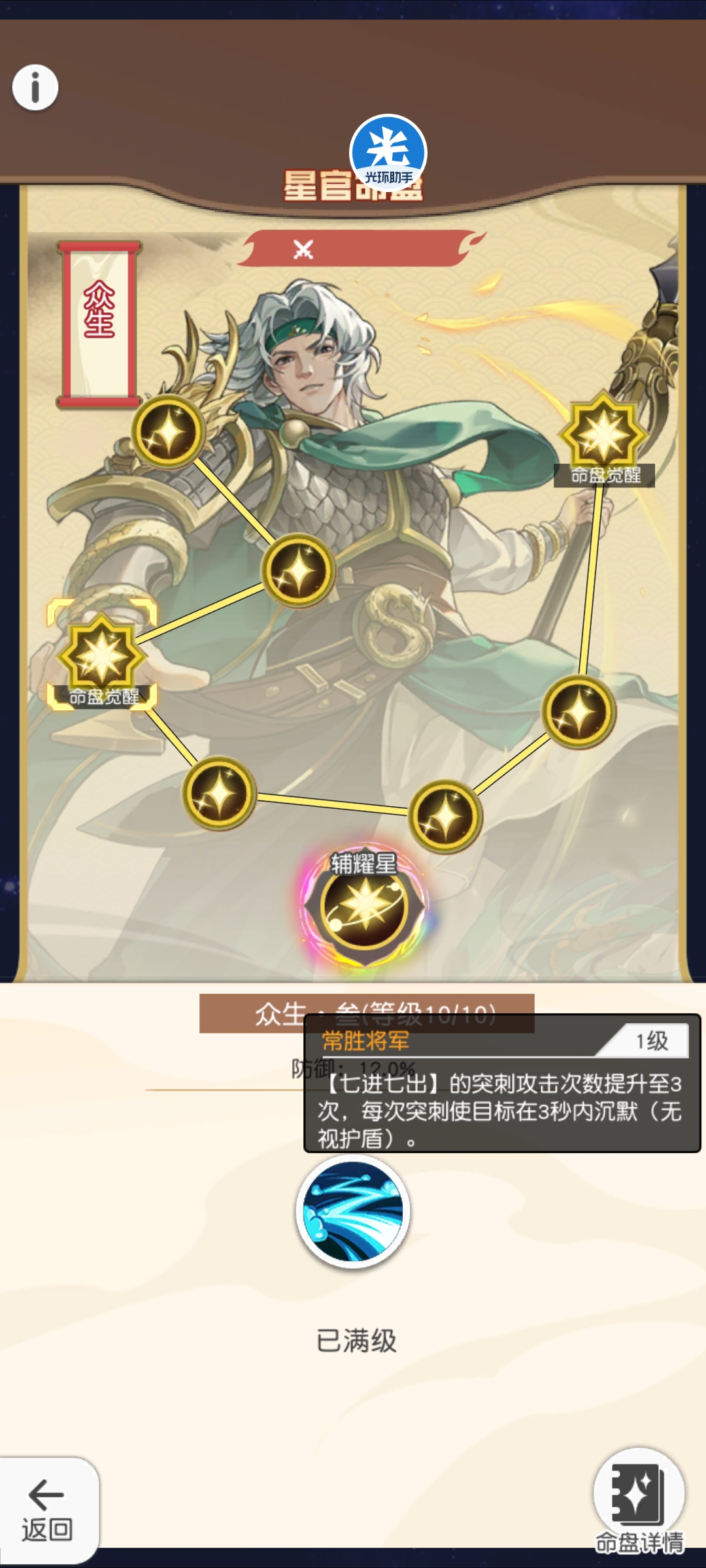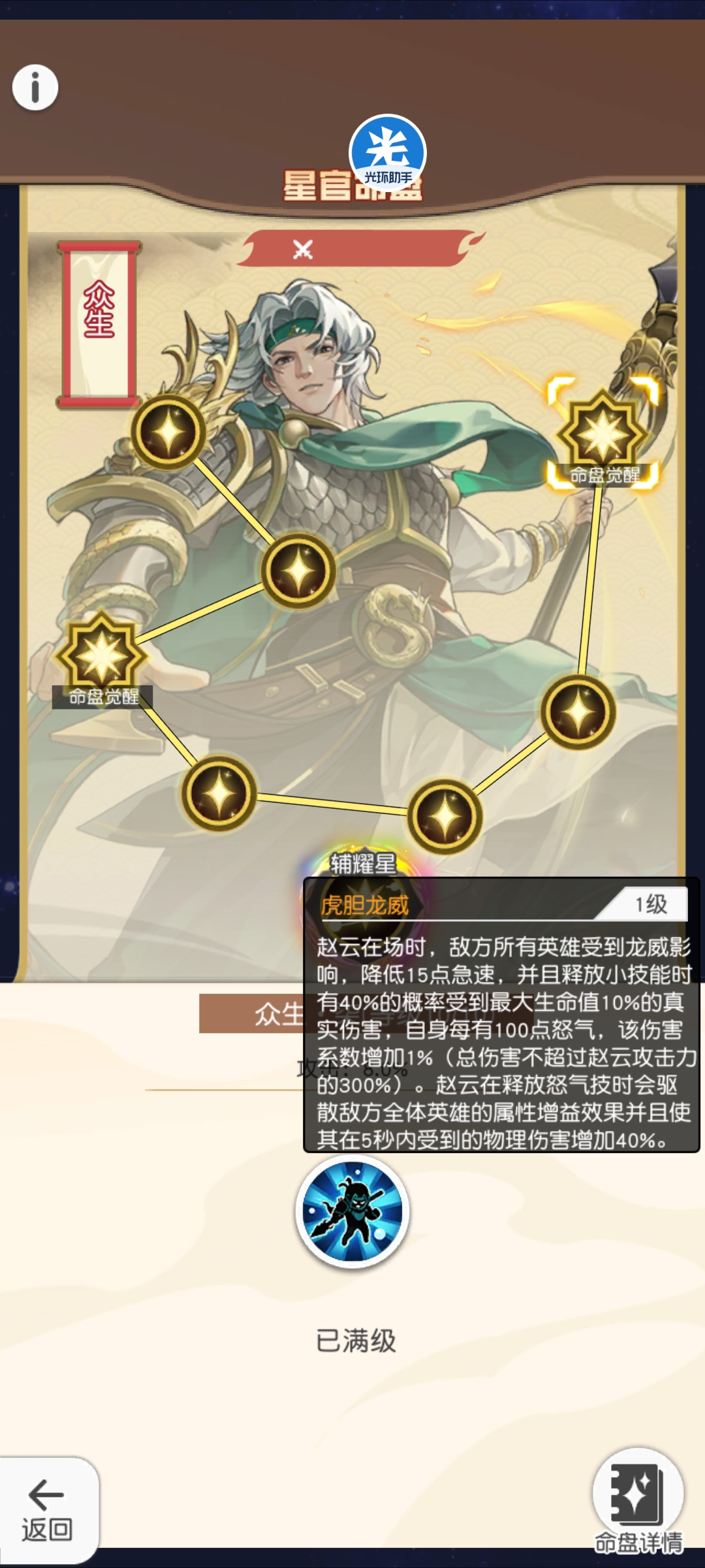 命盘效果:①赵云上阵时,降低对面阵容急速,也就是六核洗满的加速会被赵云直接对冲掉,六核变五核②释放技能有40%的几率直接扣除10%最大生命的真伤,并且怒气每高100点,伤害增幅1%,满怒情况下一次扣20%的最大生命值③赵云大招移除对面所有增益状态,并且接下来5秒内收到物理伤害大幅度增加。