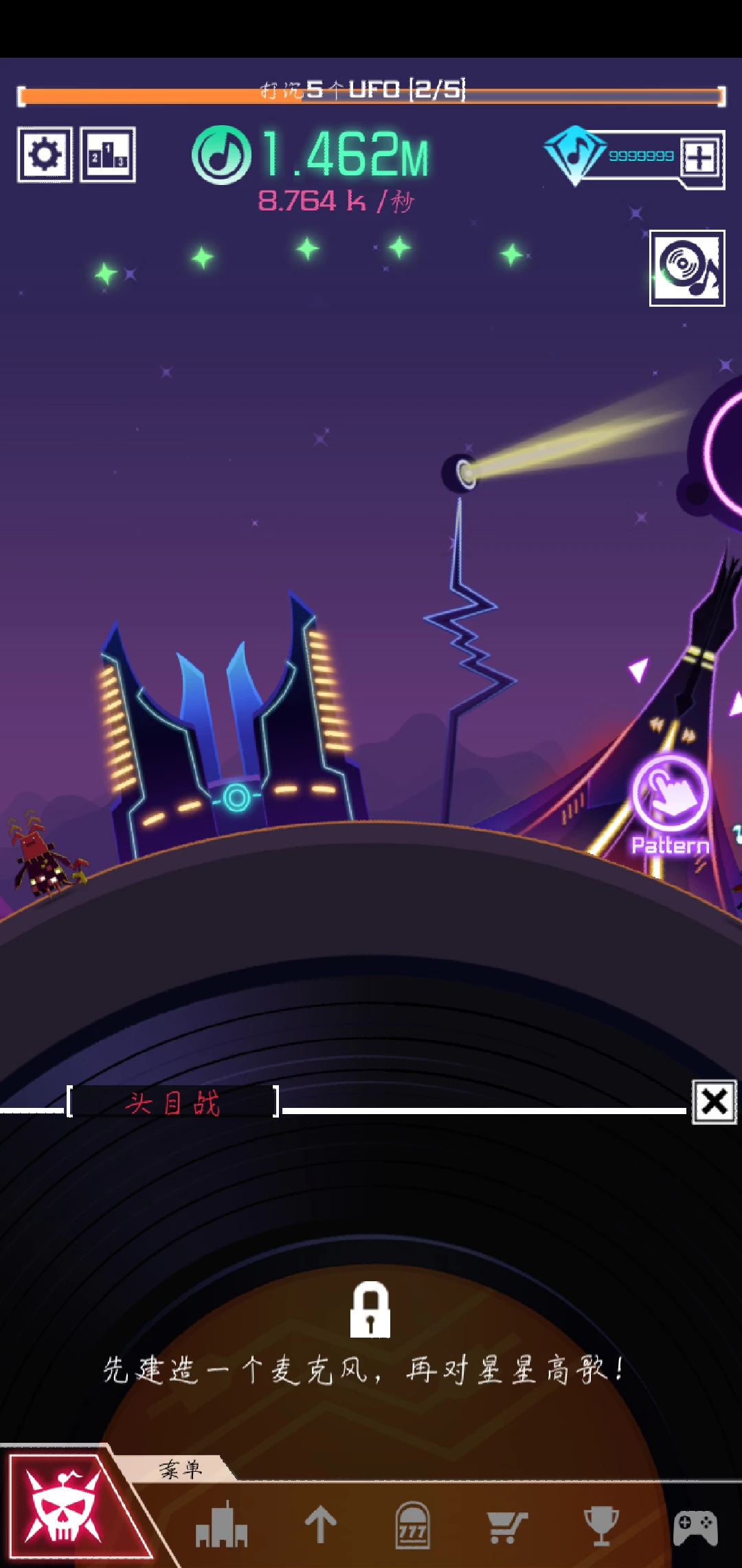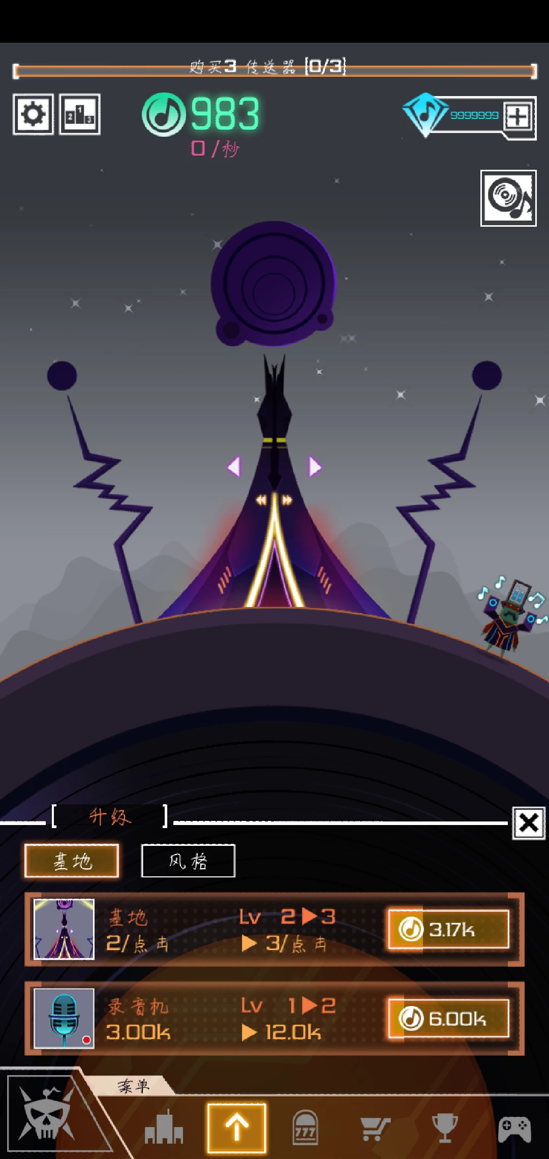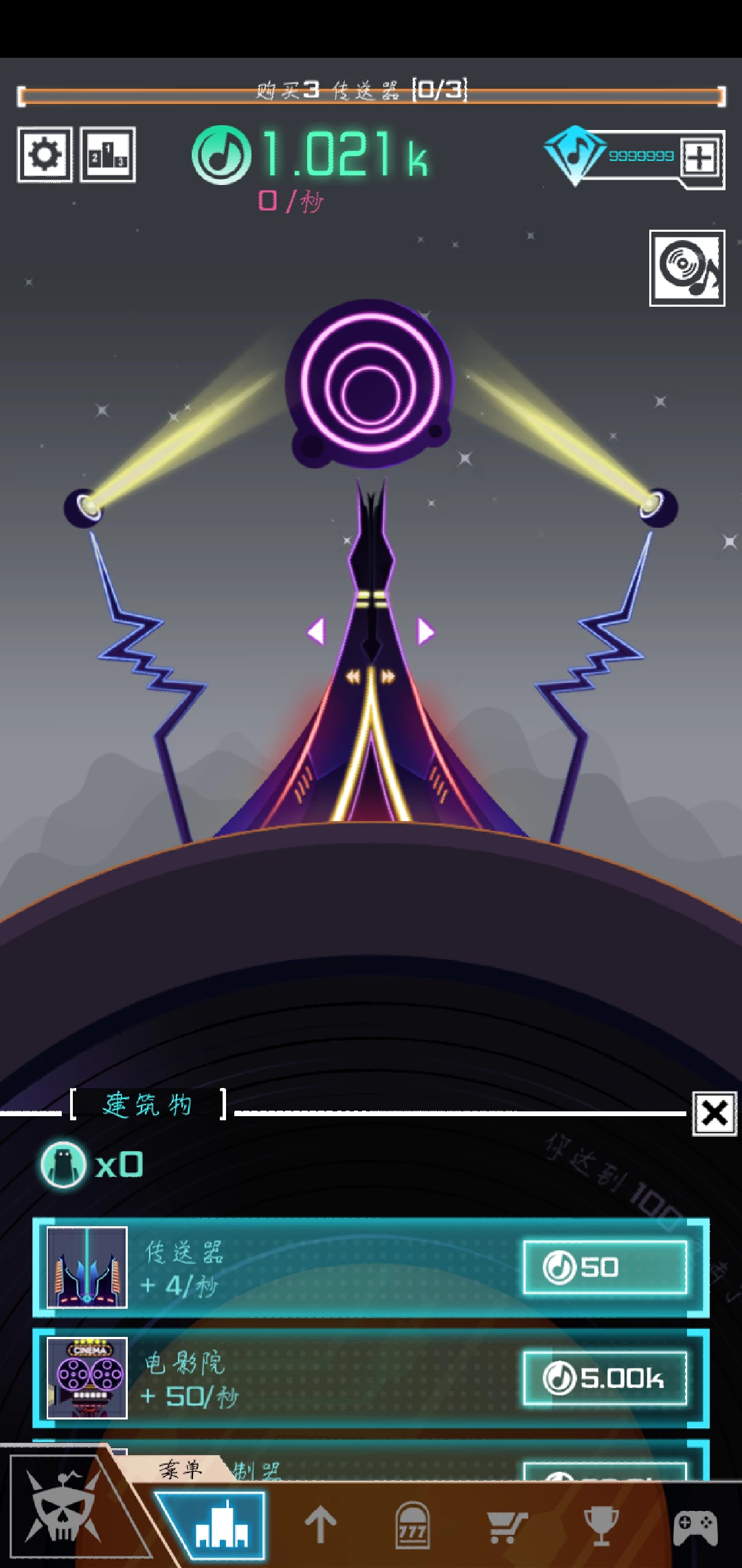 我们创建的是节奏星球,所以星球的外观就想一个滑盘(嗯。。我不太知道那个打节奏的人的专业术语),最重要的是建立起我们的基建,慢慢的获得金币,不过在我们这个节奏星球,金币都是音乐符号🎵,整个星球都充满了音乐的气氛。