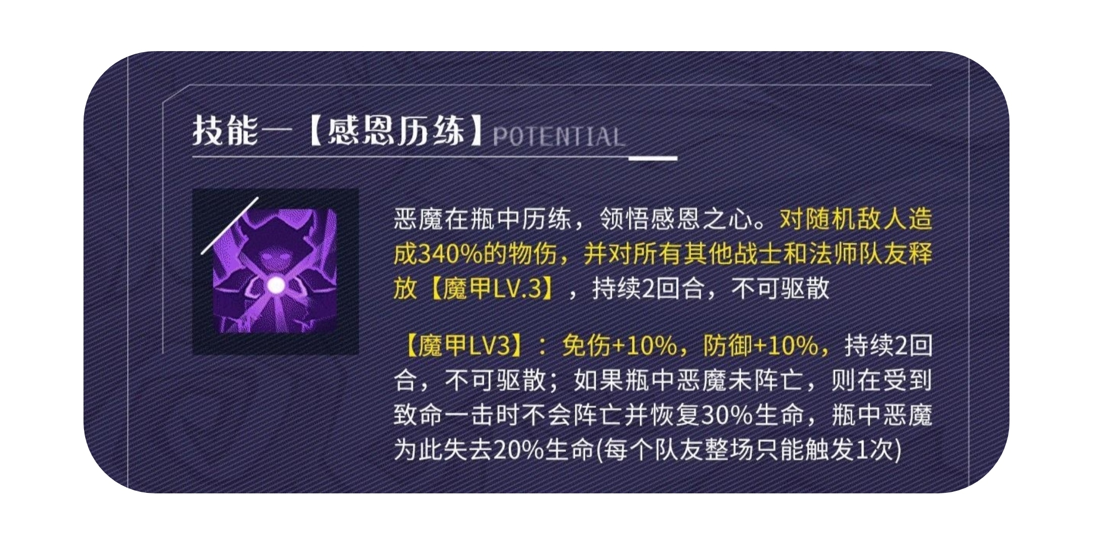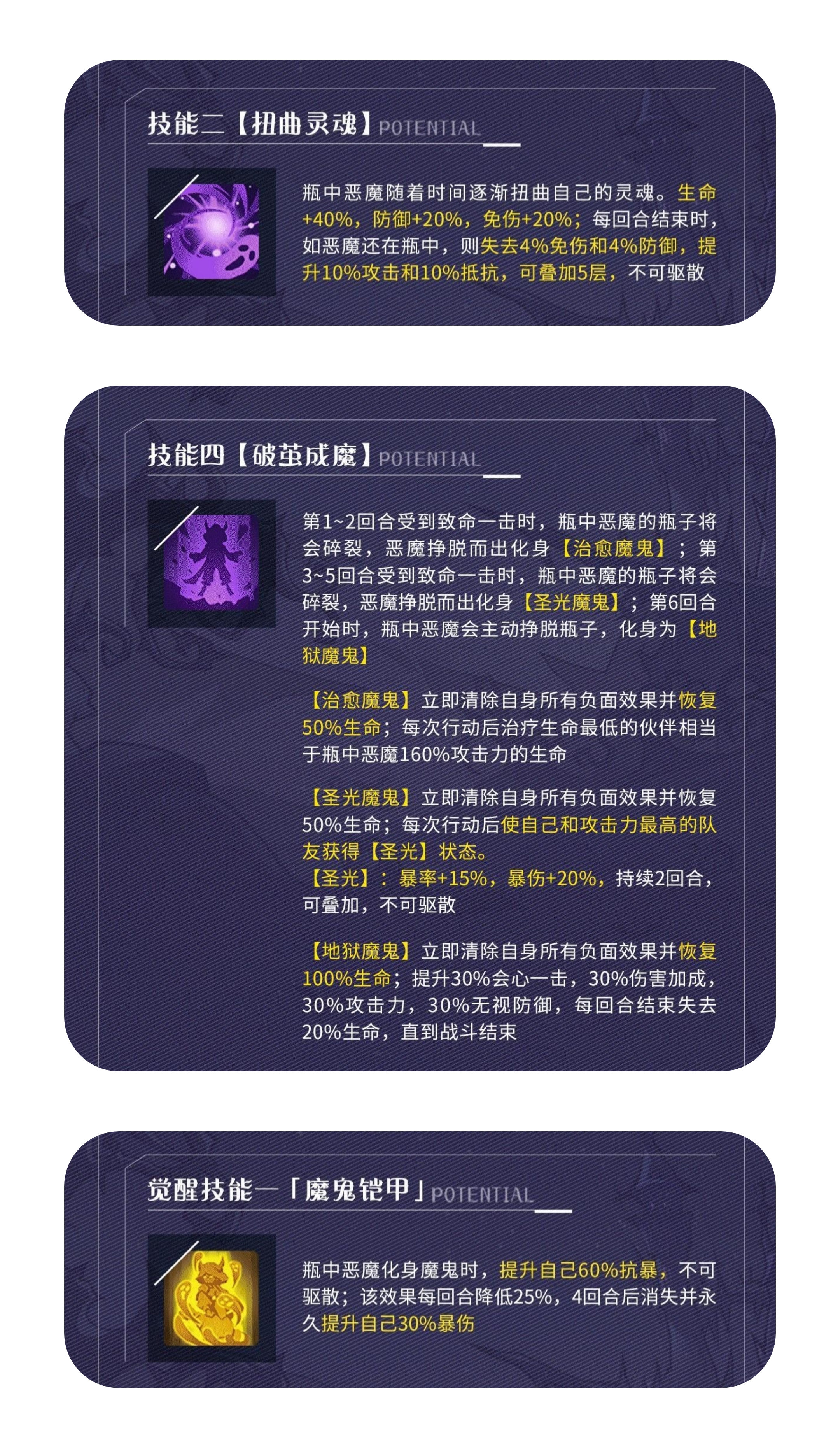 瓶中恶魔——自身具备“复活甲”,1~2具有续航能力、3~5具有辅助通用增益能力、6回合及以后具有不俗的先手单体、群体输出能力。