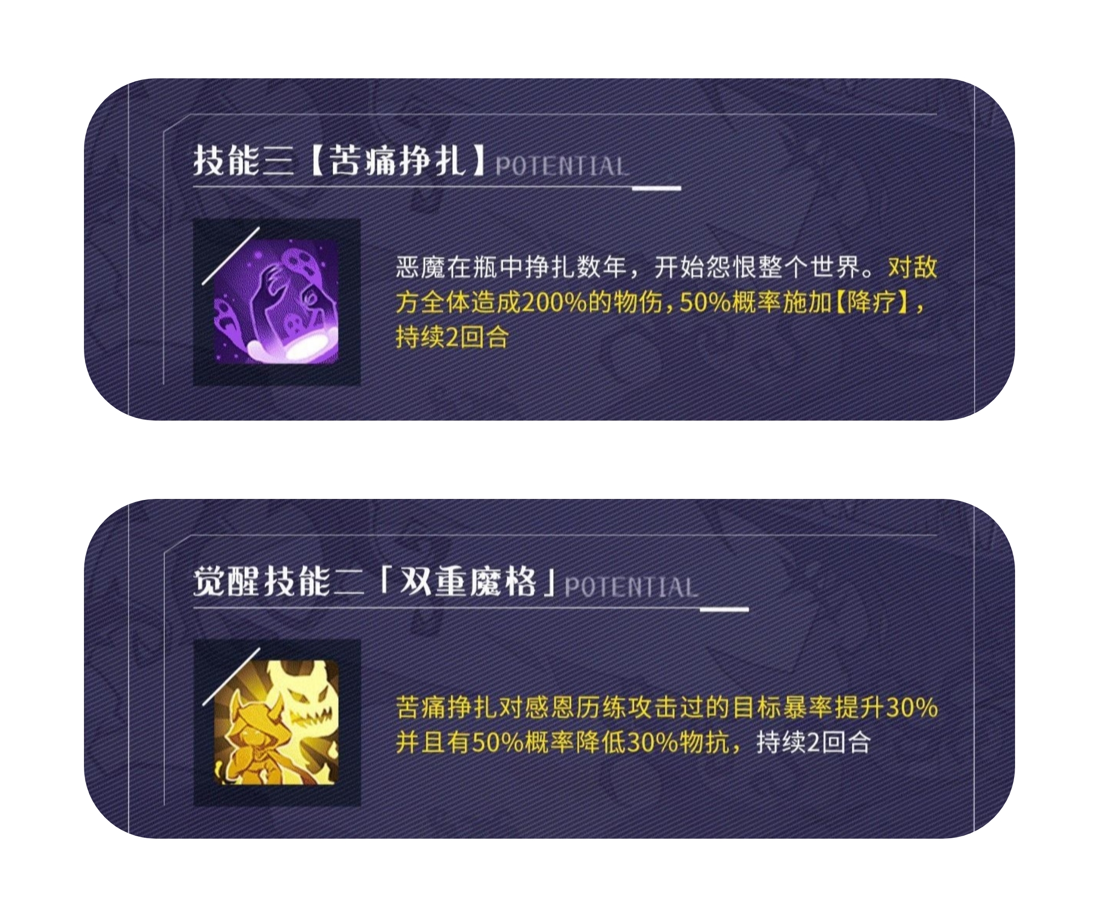 觉醒一:触发复活甲后提升60%抗暴,4回合后消失转为提升30%暴伤。