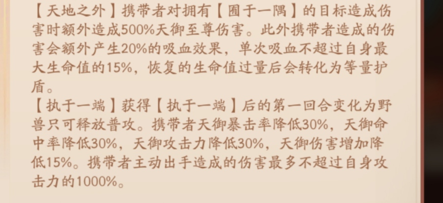 造成额外伤害,使前排三个人都有吸血效果,这个吸血比后羿弓多一点,所以说主c后羿弓,再来个山河社稷图给前排施加的效果,就可以双重吸血【执于一端】获得【执于一端】后的第一回合变化为野兽只可释放普攻。携带者天御暴击率降低30%,天御命中率降低30%,天御攻击力降低30%,天御伤害增加降低15%。携带者主动出手造成的伤害最多不超过自身攻击力的1000%。