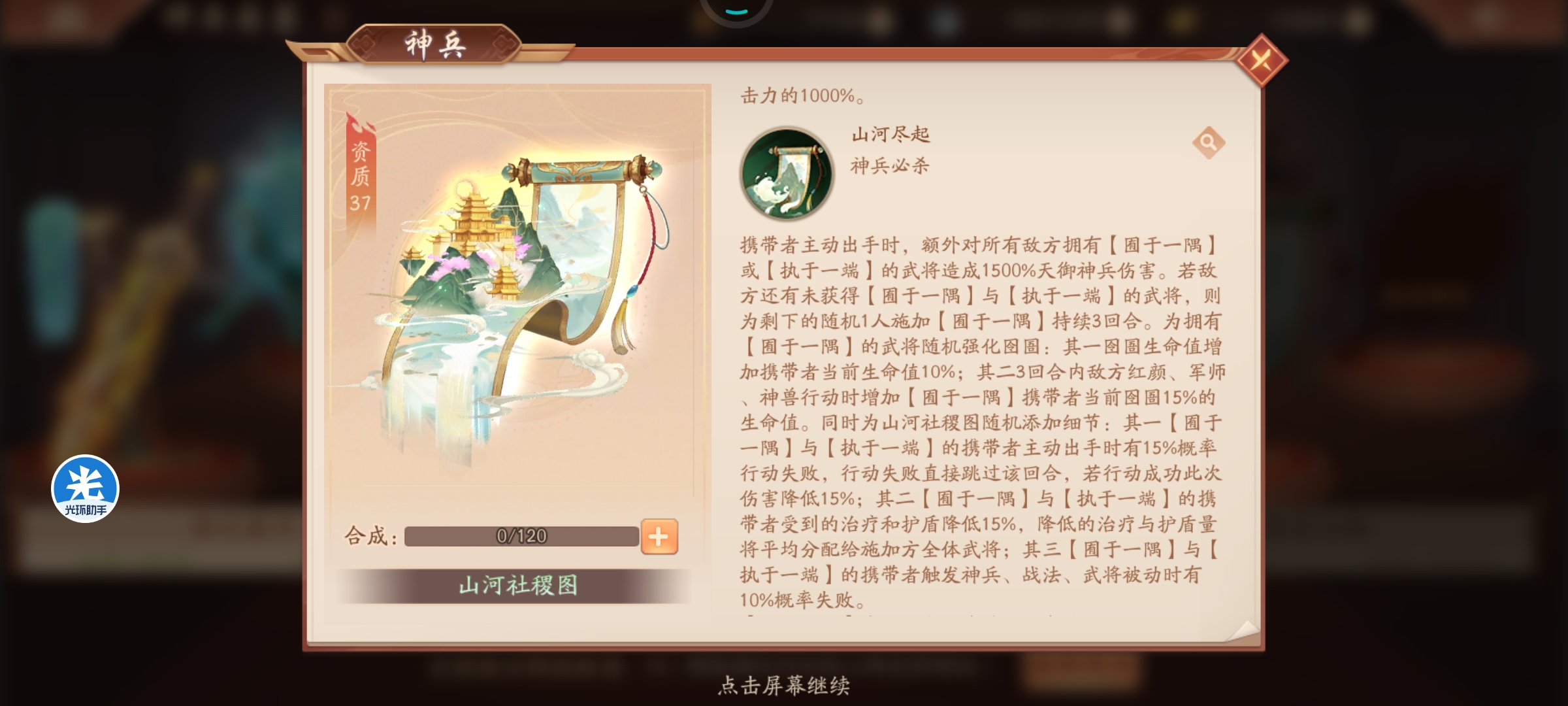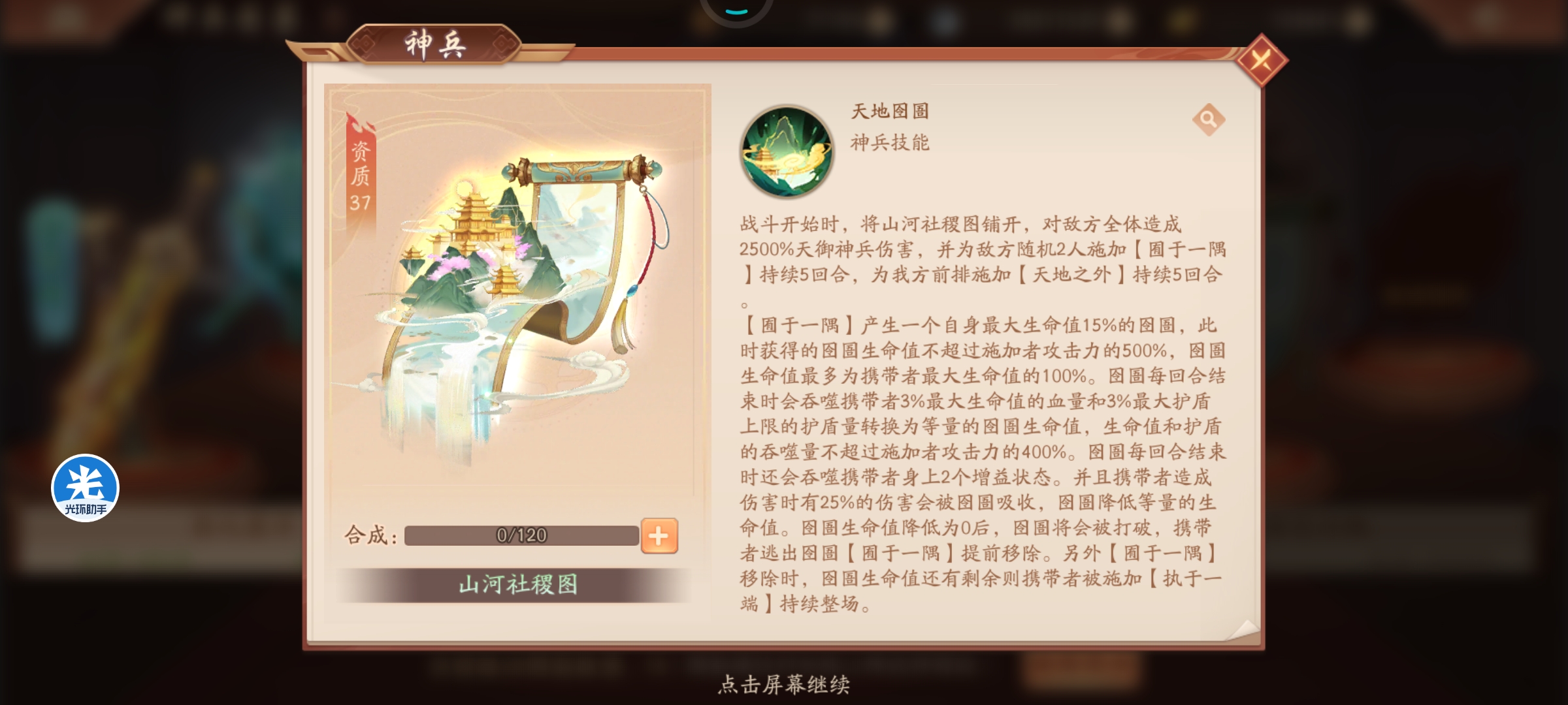 战斗开始时,将山河社稷图铺开,对敌方全体造成2500%天御神兵伤害,并为敌方随机2人施加【囿于一隅】持续5回合,为我方前排施加【天地之外】持续5回合