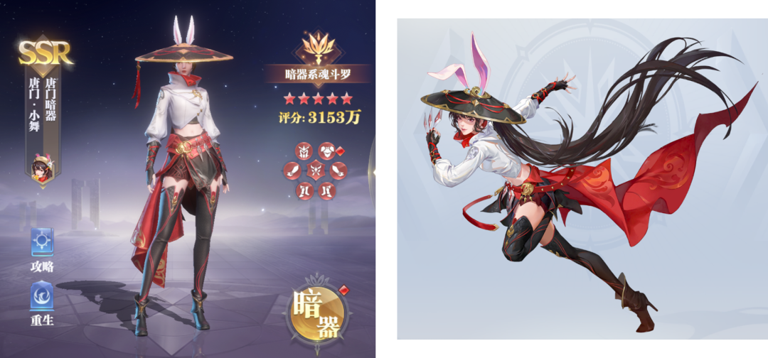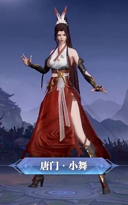 首先唐门小舞的游戏实际建模和立绘大家可以参考上图,的确有一些侠女的气息,同时也外带一些小舞本身的特点,例如头上的兔耳朵等饰品,不过这个斗笠就是有点太碍眼了,几乎是挡住了唐门小舞的眼睛,有点尴尬......