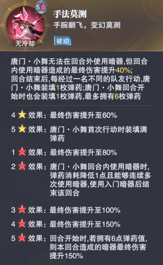 回合开始时,若唐门小舞有6点魂力,则回合内最终伤害额外提升150%,这点只要是6人上阵且唐门小舞行动不要过于频繁的话都可以达成