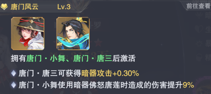 此外唐门小舞的契合关系可以让她在使用【佛怒唐莲】时提升其伤害。所以从其【暗器百解】和使用逻辑来看,唐门小舞比较好的暗器搭配应该为:【凤引九雏】+【佛怒唐莲】+【蝠翼轮回】+【一千零一夜】,她的回合内连续使用暗器特点可以完美的适配这一组暗器的流转、输出与增伤特色,而暗三则则可以考虑带【孔雀翎】+【追魂夺命胆】or【阎王贴】给小舞提供不错的增伤即可。