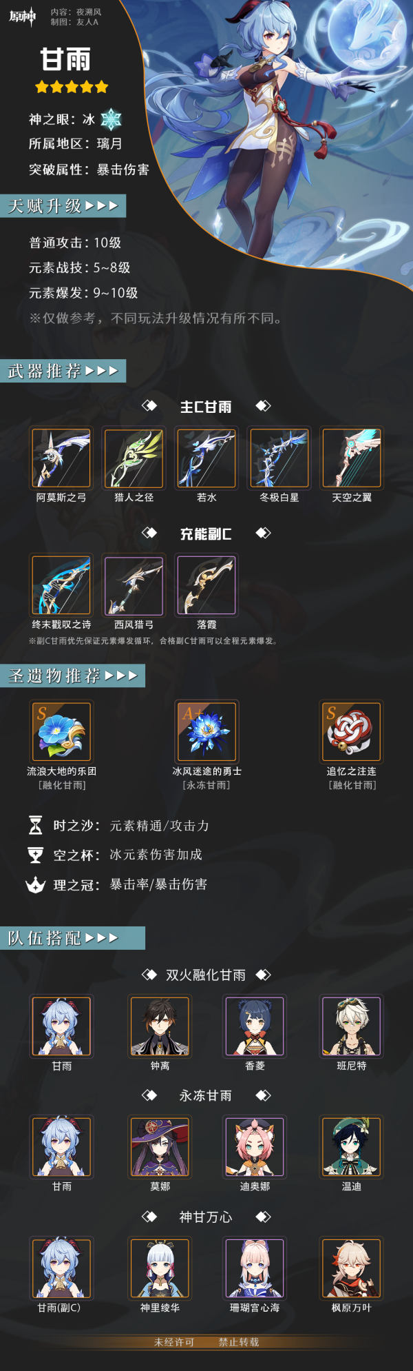 5.甘雨自身有暴击天赋加成,但甘雨攻击频率慢依旧是高暴击的角色来稳定伤害推荐暴击65%和80%之间。