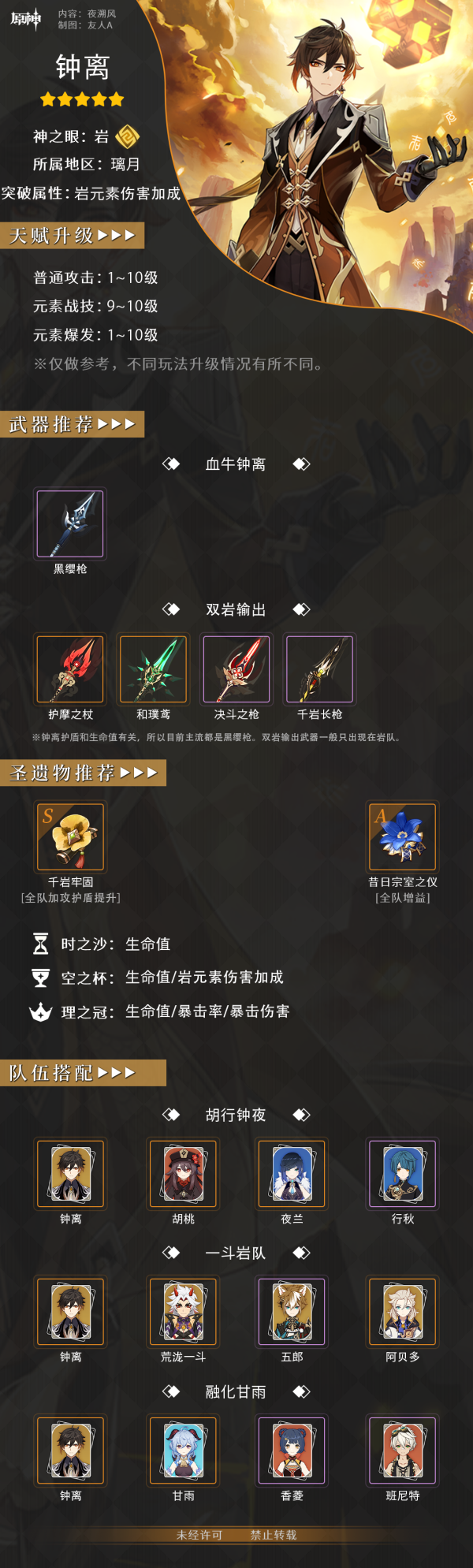 (2)钟离武器选择三星武器黑缨枪即可,圣遗物推荐千岩四件套。只需要堆生命值即可,钟离达到4.5万血量就有非常强力保护能力。